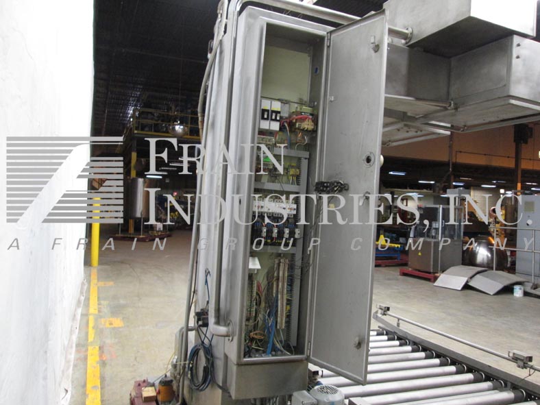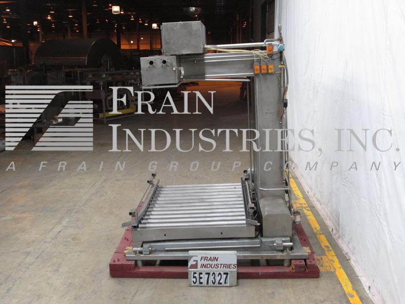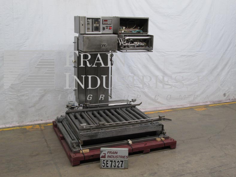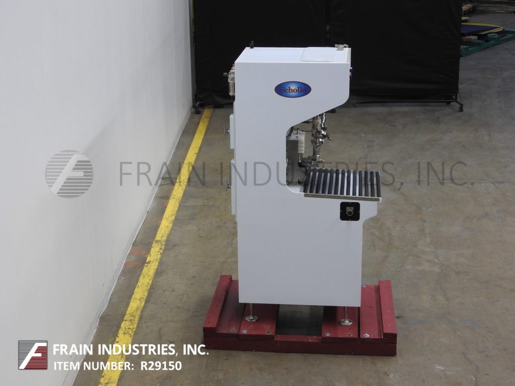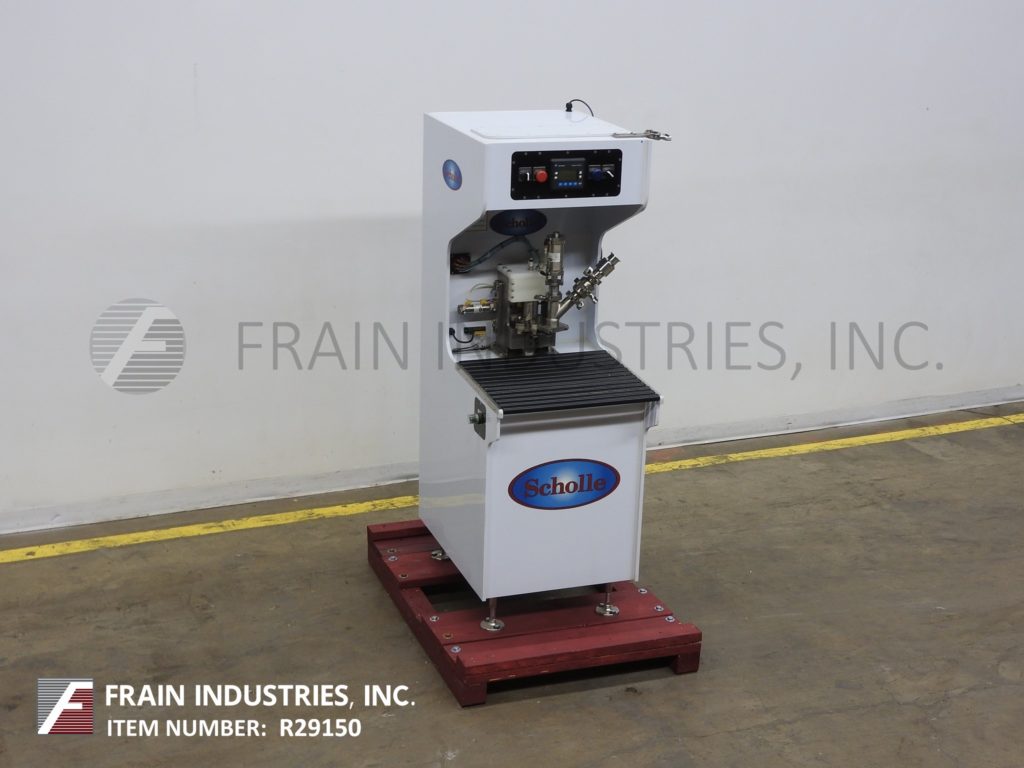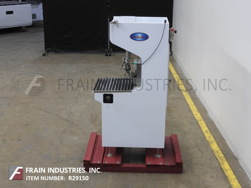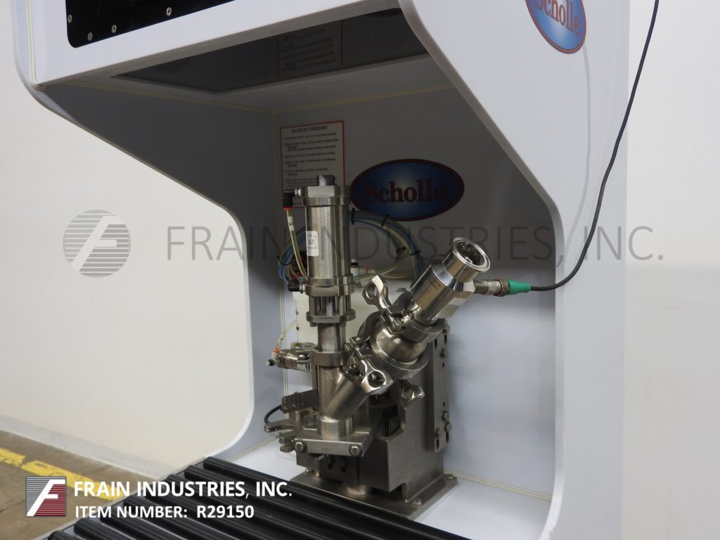 Scholle AF-21-S型,半自动,单头,拆袋机,充填袋机,每分钟有袋数-根据材料,应用和操作熟练度而定。单机操作,灌装范围从1加仑到6加仑。配有单开盖、灌装和旋盖头,1" OD / 1/2" ID灌装喷嘴,22"长x 19-1/2"宽滚轴袋平台,1" OD滚轴位于1-1/2"中心,3/4"间隙,盖传感器,泵和CIP系统。控制面板有A/B PLC控制器和A/B面板视图和机器上,关闭,运行开关与e-stop和流量/循环上,关闭开关与停止按钮。安装在基础框架与水平腿。