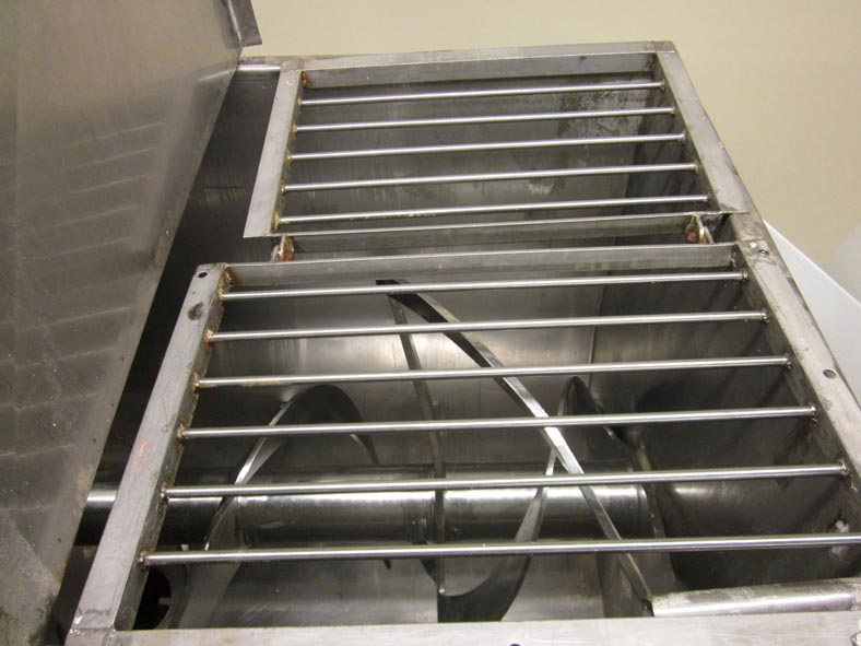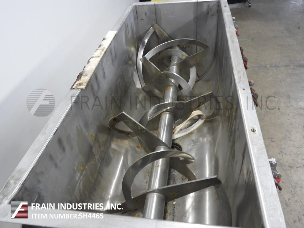 100立方英尺(80立方英尺工作容量),304不锈钢,带状搅拌机。船尺寸:长度96英寸;40“宽;48”的深度。配有不锈钢抛前盖,12“OD / 10”ID法兰顶部中心入口,24“×24”入口网保护,3.5“OD Tri-clover入口38”外径/ 24”内径打断带1 - 1/2“宽x 1/2“厚外丝带和3“宽x 1/2“6厚内丝带”直径轴,和一个14" OD / 10" ID法兰中心底部卸料与气动滑门。