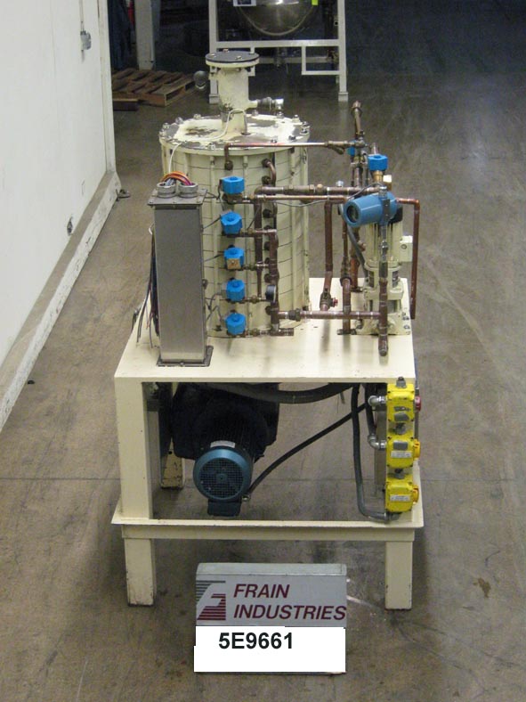 Aasted,2000型,16板,巧克力调温系统额定功率高达2000公斤或每小时4400磅的具有6巴的最大压力额定值 - 根据材料和应用。配备有18" 外径×44" 高回火室,(16)的板,18" 外径×2-1 / 2" 高水夹套板,刮面搅拌区和法兰螺栓下盖子与(24)½" 上3个螺栓“中心和顶部8” OD / 6" ID与法兰(8)1/2" 顶部端口的螺栓孔3" 中心和底部3" ID底部产物端口和侧3/4" ID侧水循环端口和底部15马力的电动机驱动并具有开/关的电源开关。安装在40" ×36" (4)腿平台帧。