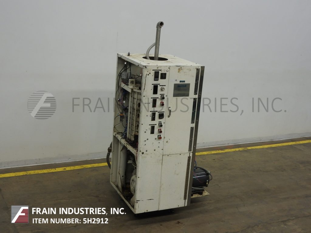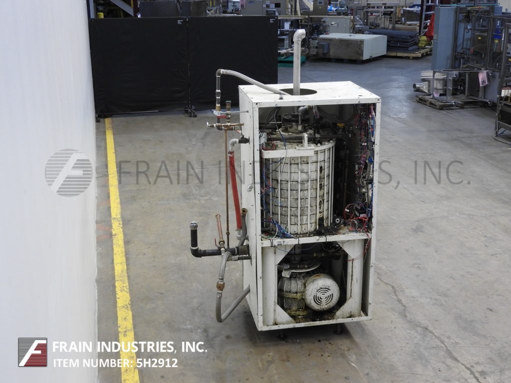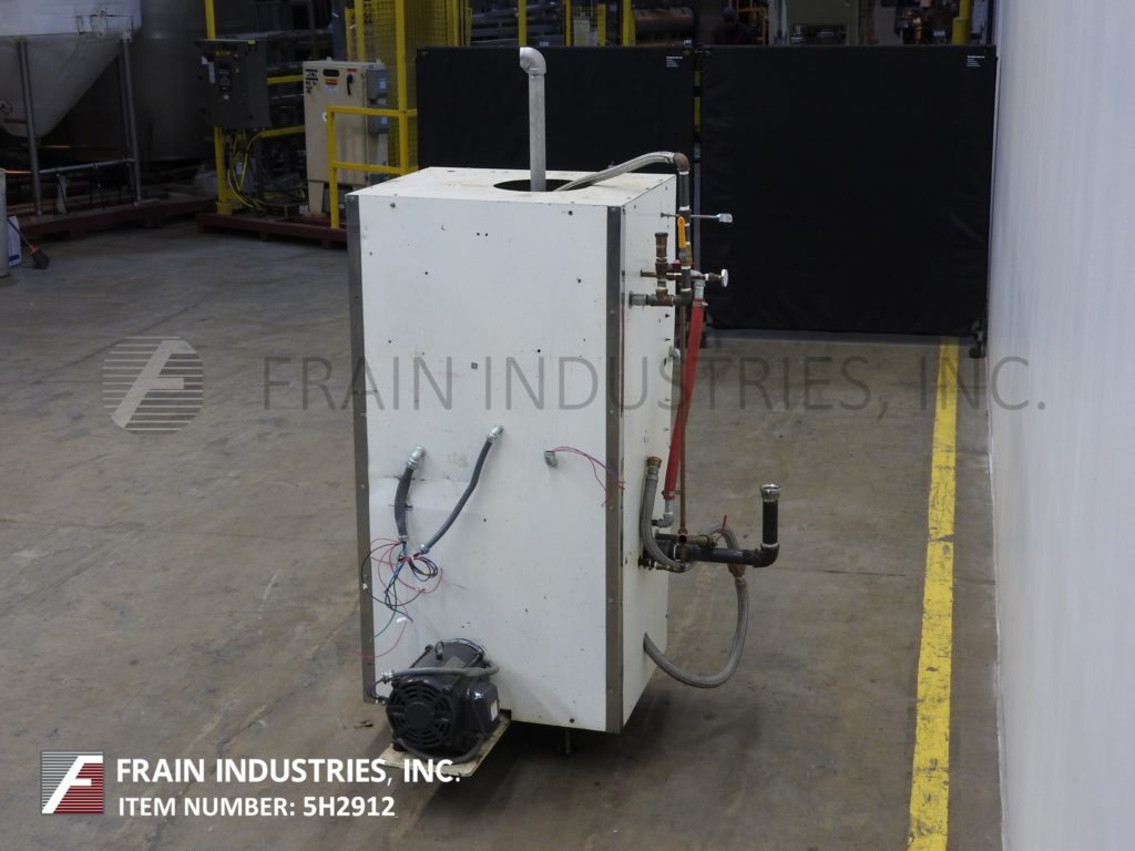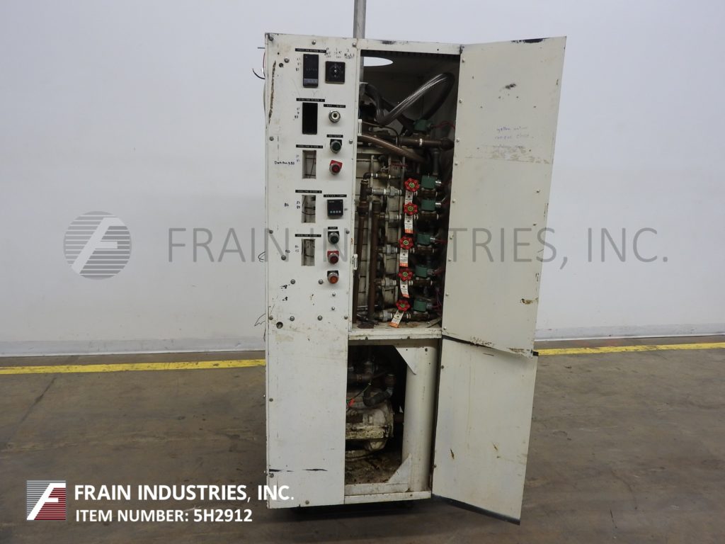 Aasted Model 1000, 8盘巧克力回火系统,额定压力可达每小时1000公斤或(2200磅),额定压力可达6巴——取决于材料和应用。配备18"外径x 24"高温回火室,并有(8)18"外径x 2-1/2"高水夹套和刮削表面搅拌板。顶部法兰螺栓下盖有8"外径法兰和(28)1/2"螺栓在3"中心和3"内径螺纹端口和温度计。2-1/2"外径螺纹底部端口,3/4"水和产品循环管道和底部电机驱动。封闭式室有(5)温区热控制器、水泵、主加热器、日间冷却、日间再加热和夜间加热开关。安装在(4)腿架上。