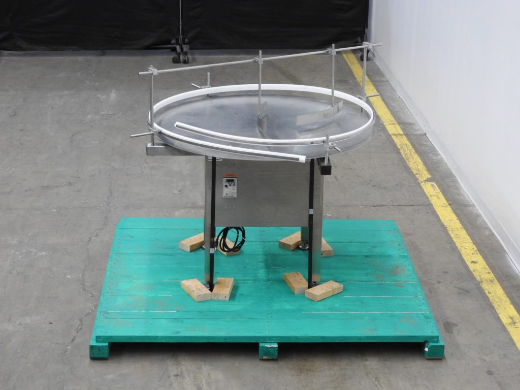 Accutek, 48"diameter, stainless steel, rotary disc accumulator with number of containers per minute – depending on materials, application and machine configuration. Equipped with stainless steel 48" disc with variable speed dial, adjustable side rails and a table height of 32" to 35".