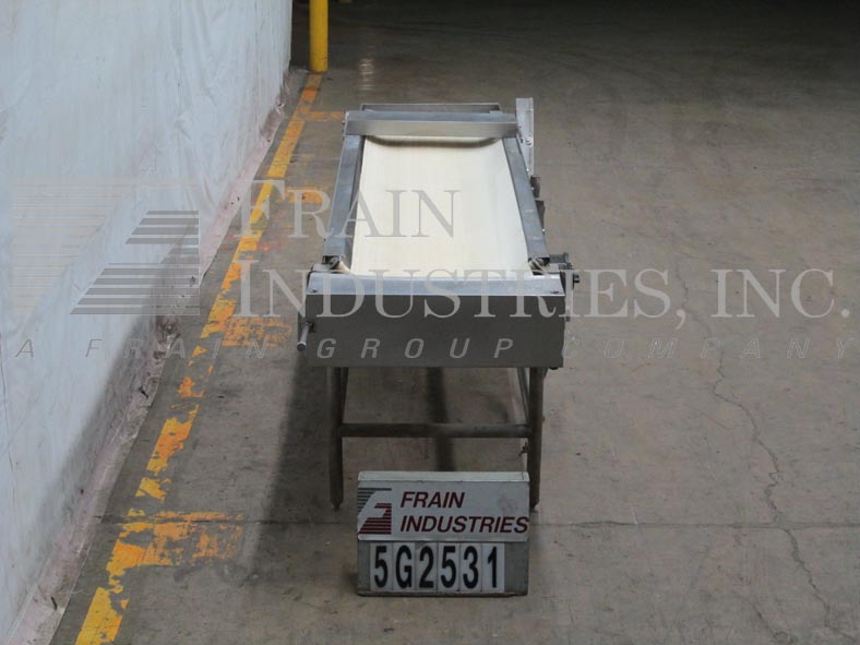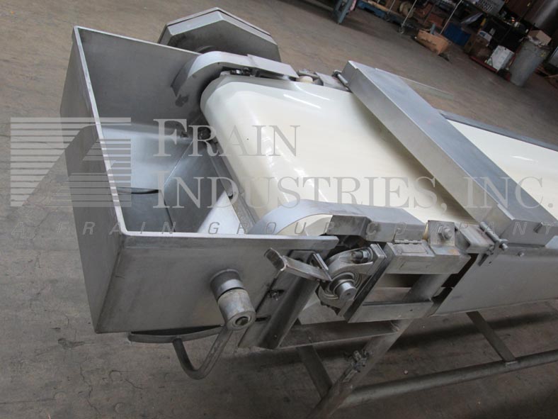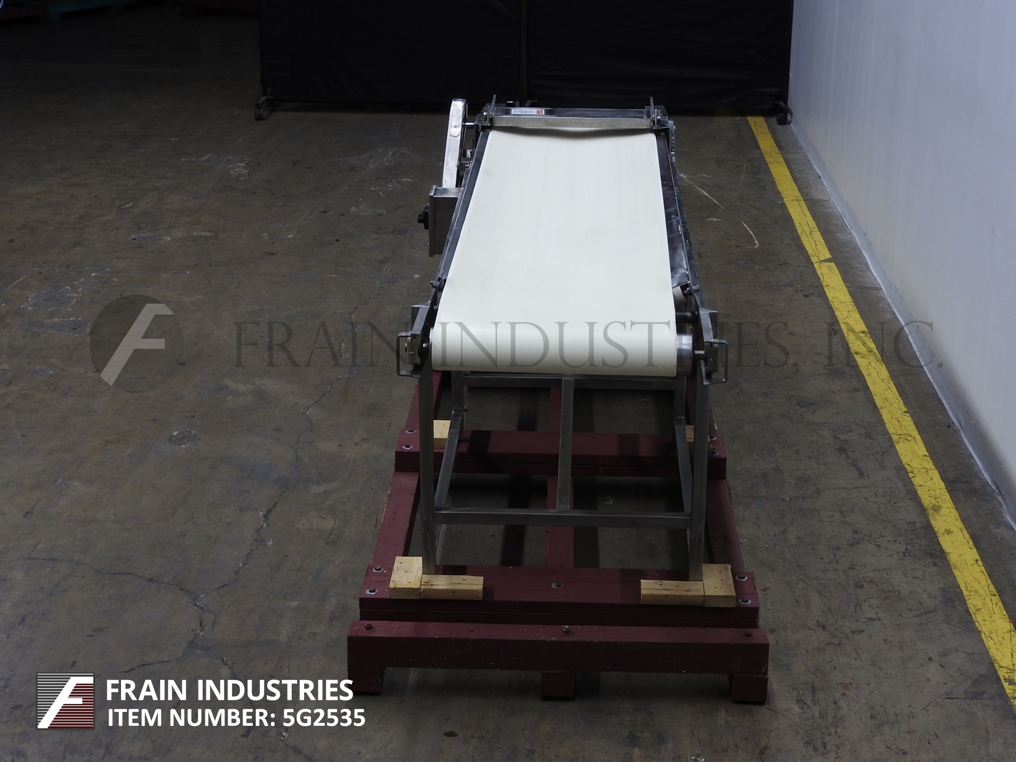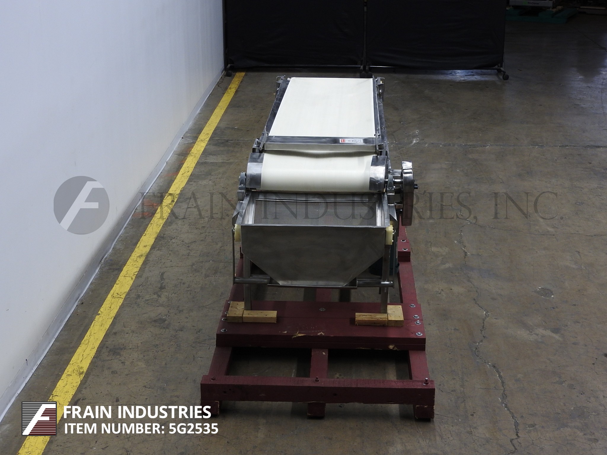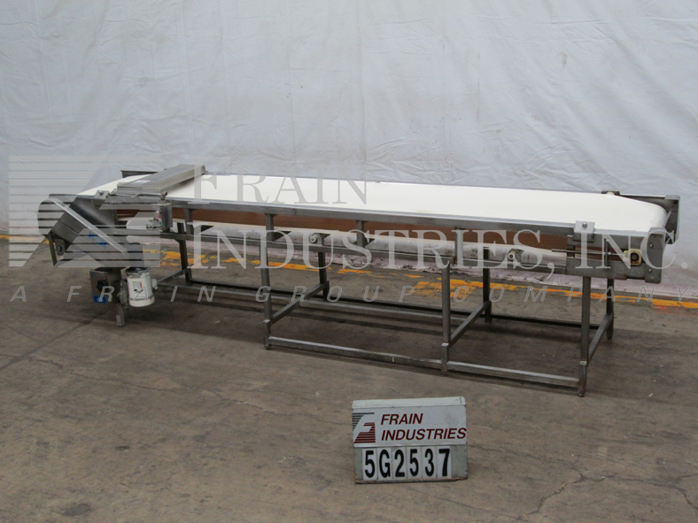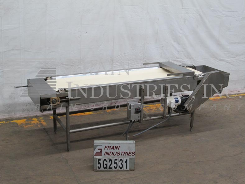 不锈钢,23"宽x 105"长,橡胶带检查输送机。产品通过一个29" x 9"高强度翻转磁铁倾倒到一个26" x 14" x 14"料斗与17"地间隙。配备2马力驱动和启动/停止断开和安装在不锈钢框架高度可调腿。