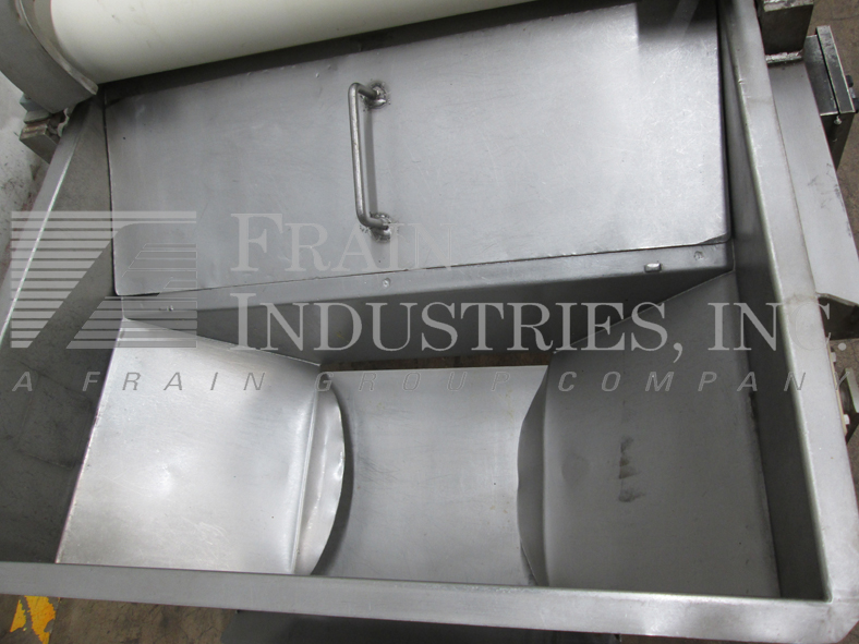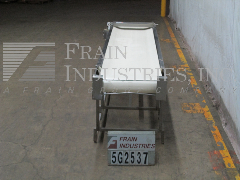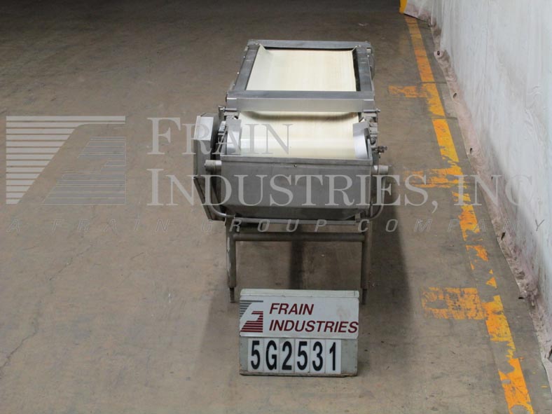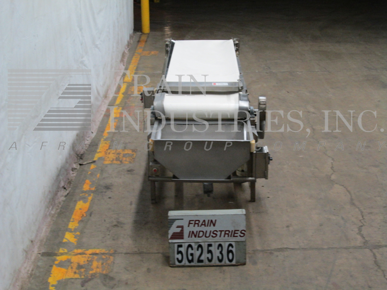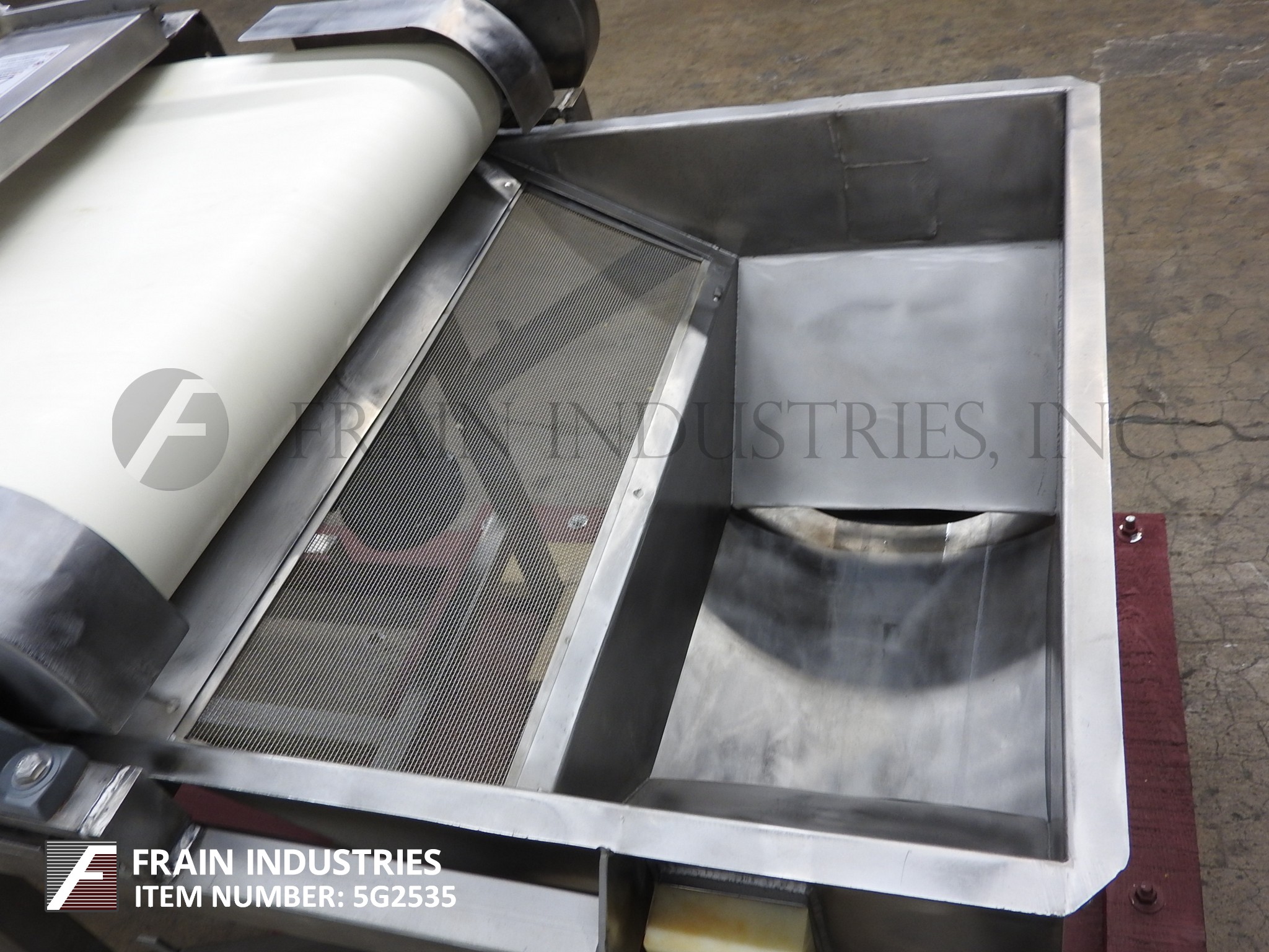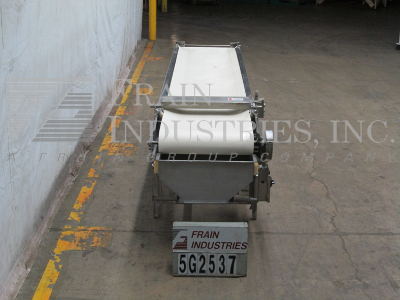 美国食品,型号200GM,不锈钢,23“宽X 115”长橡胶带检测输送机。产品在24英寸宽x 7“长的高强度倒装磁铁中通过,然后倾倒到27”x 21“x 13”料斗中,以19“接地间隙。配备¾HP驱动器并启动/停止断开,并安装在带有高度可调节腿的不锈钢框架上。