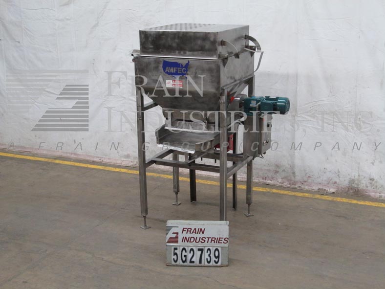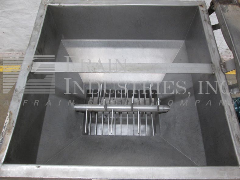 Amfec, 684型,不锈钢碎块机和振动给料盘。配备一个33"宽x 33"长产品料斗11"直墙,提升盖与安全连锁,(12)固定钝冲击刀片和一个22"宽x 30"长饲料锅与4"高墙。