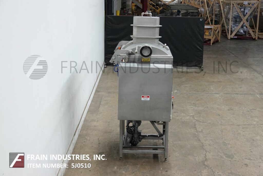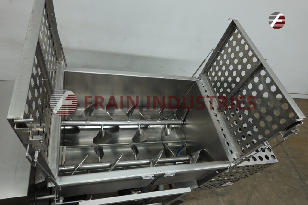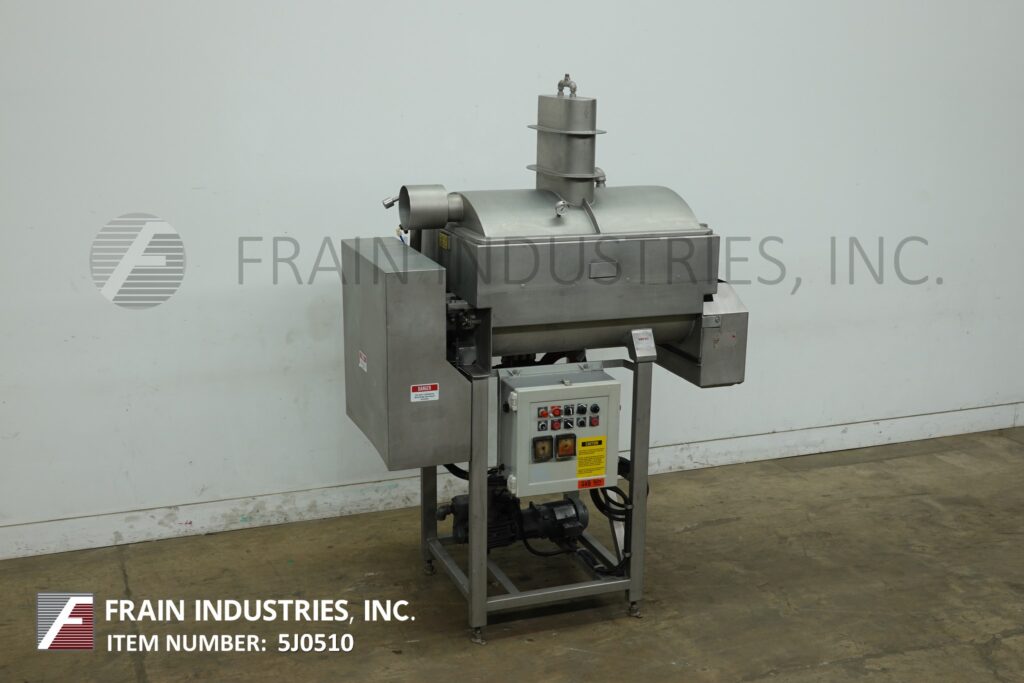 Amfec, Model 510, 26 ft³ (18 ft³ working capacity), 304 stainless steel dual trough vacuum ribbon mixer with pounds of product per hour – depending on materials and application. Equipped with dual mixing troughs with inner dimensions of: 41" in Length; 31" in Width; 21¼" in Depth. with 1½" wide x ¼" thick stainless steel single ribbons on 2" OD shaft, 2 hp vacuum pump, (2) 3 Hp motor drives with safety guarding and dual pneumatic discharge gates with 45" ground clearance. Control panel has push button start / stop, forward / reverse controls. Mounted on (4) stainless steel legs.