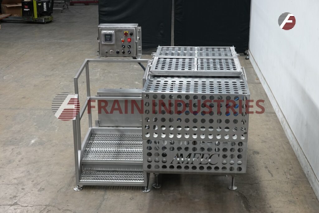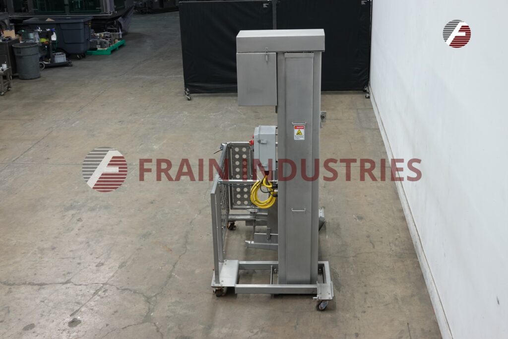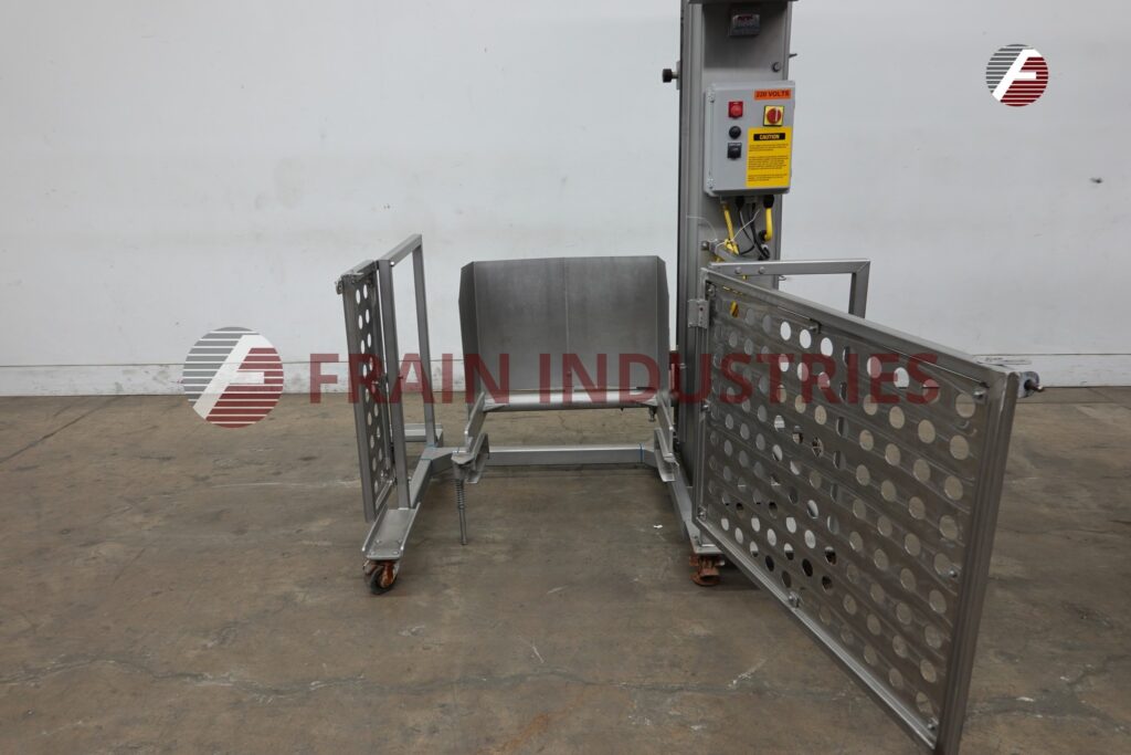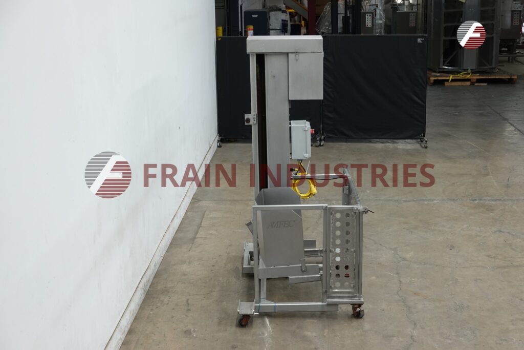 AMFEC, Model 2-3k, column cart dumper. Rated to a maximum capacity of 1,000 lbs. Equipped with a 29½" x 23" cart holder. Lift is powered by a 3 HP drive and has a discharge height of 60".