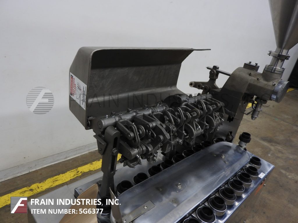 Arenco GAB型,半自动,间歇运动,22个工位,金属管填料,额定每分钟10到30管的卷边器-取决于材料,应用,机器配置和操作熟练度。管尺寸范围:直径10mm至50mm;高度30mm至250mm。灌装范围:1ml至250ml。配备不锈钢产品料斗,底部向上填充,(22)口袋旋转管架输送机,可向前和向后运行,操作员装载区,填充工位1/2”外径填充喷嘴,1-1/4”内径5”长活塞,三工位折叠和底部压接工位和翻转安全装置。安装在施法者。更换所需零件以适应尺寸范围和填充范围。