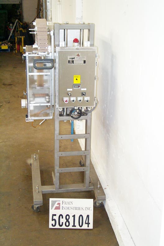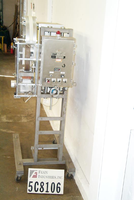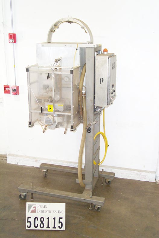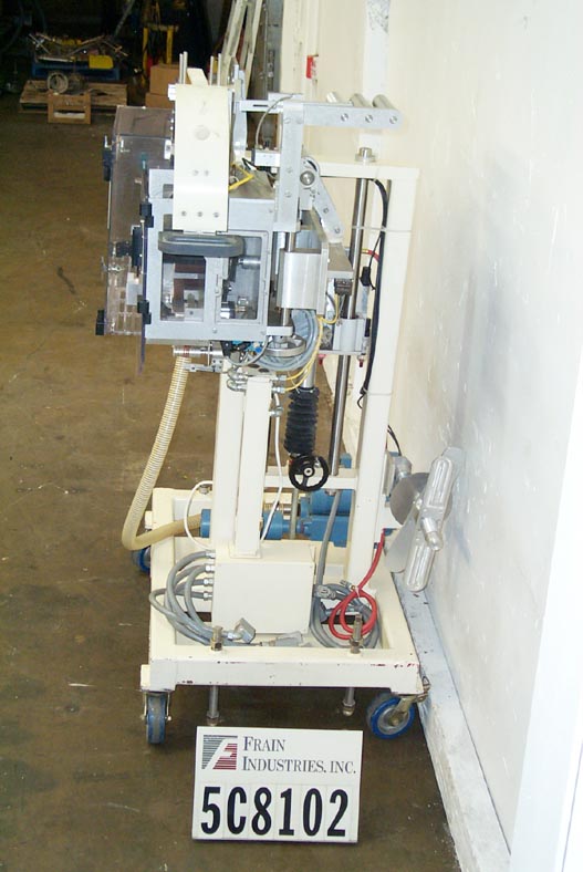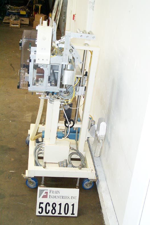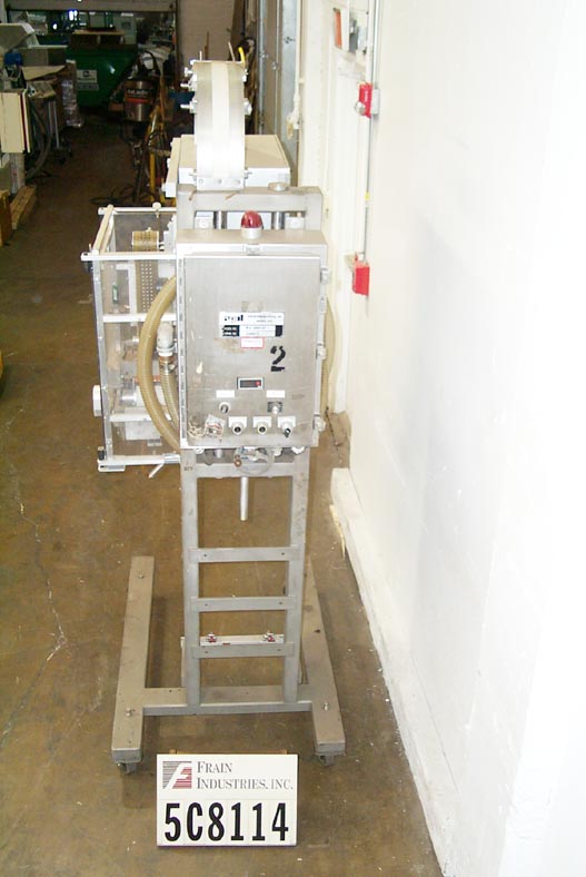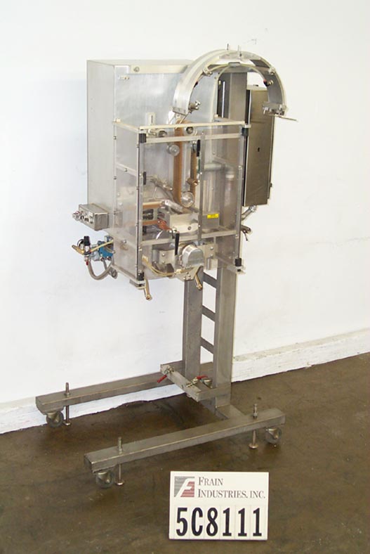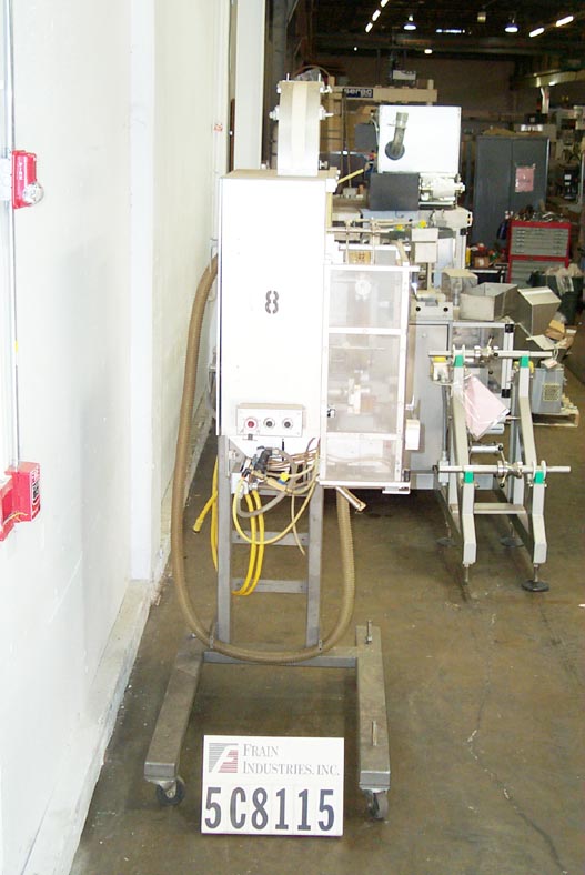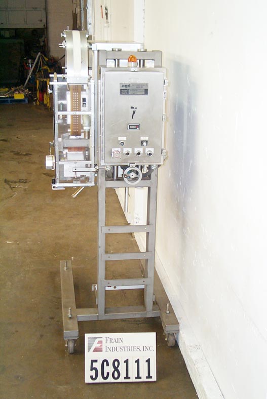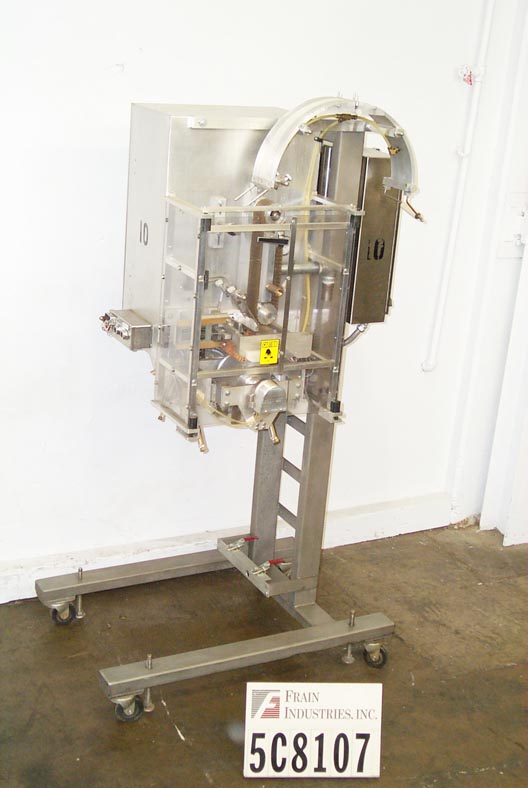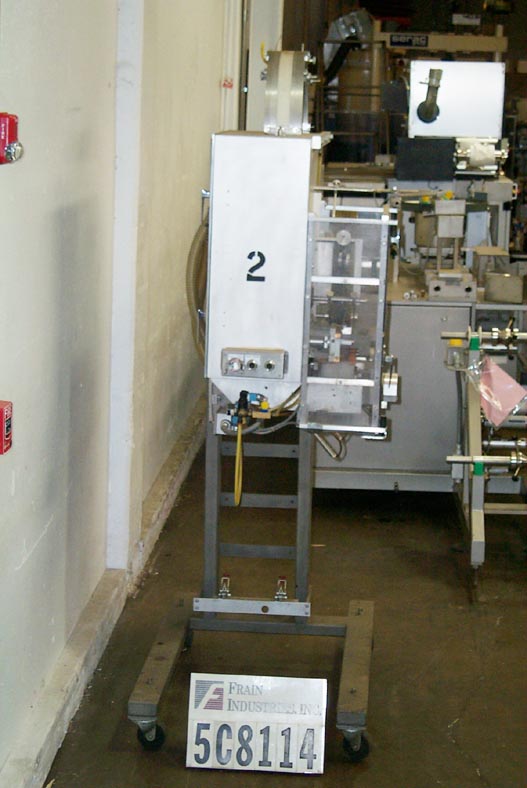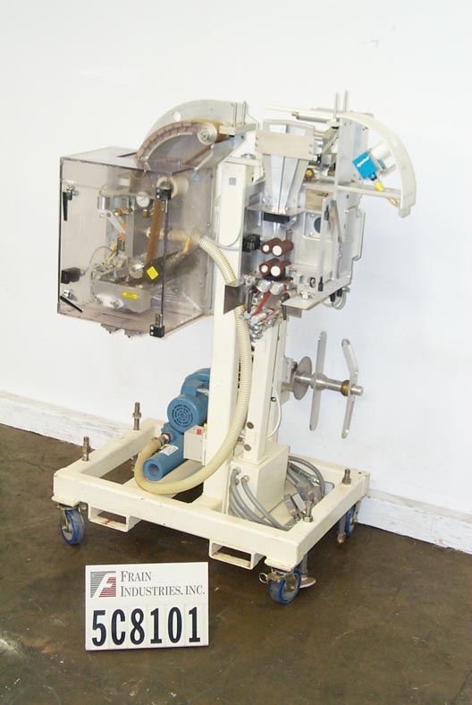 自动,优质袋和优惠券点胶机,可达50袋和优惠券每分钟。袋:(2 1/4“- 7”)L x(2 - 4 3/4”)W x(0 - 1 1/2)厚。卷板:(2" - 6")长x长至6"宽。有两台机器安装在普通机架上,对位,刀切断,带式送料,3"W真空带,中心折叠卷板,手动曲柄头高度调节,伺服控制器,电气联锁屏障保护。安装在环氧涂层框架与脚轮,高度可调脚,和叉车轨道。最后把玩具和优惠券放进麦片盒里。