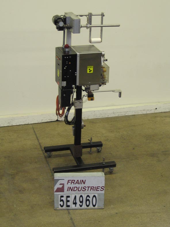 自动,干燥剂或袋饲料额定速度高达245ppm取决于袋的大小。专为分配预先制作的小袋和有一个大小范围:3/4”- 3 1/2“L 3/4“- 3”W x 1/32“5/16”厚,12“W OD产品卷1 1/2 " ID核心,登记,没有容器/袋,剪刀切断,手动曲柄可调节高度的列,开/关控制,安装在H-base类型框架锁定脚轮偿还现有的输送机。