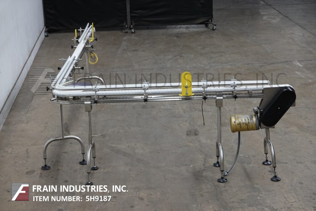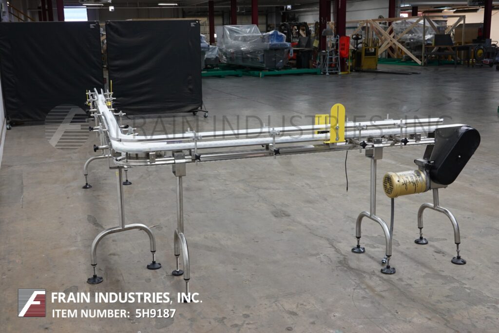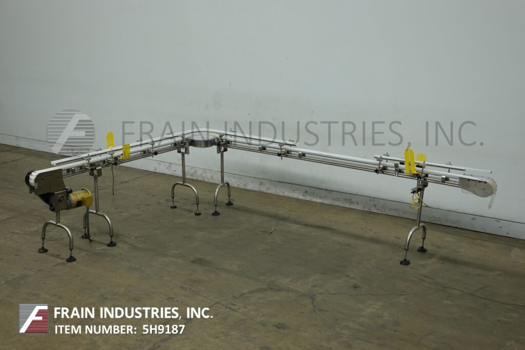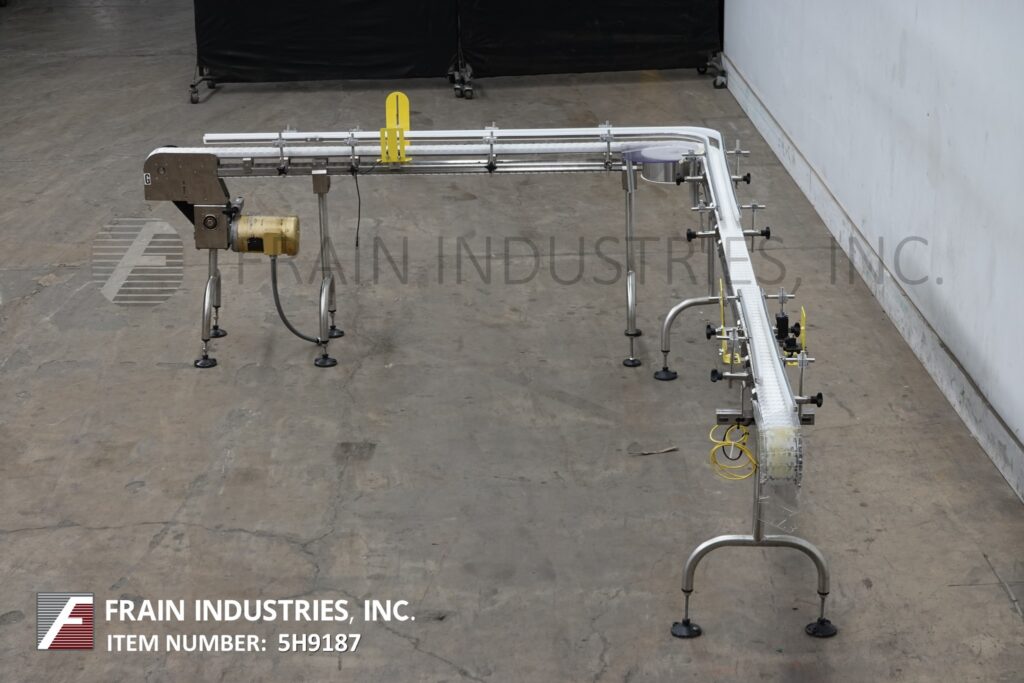 Autopak, 90° 3¼" wide x 156" long, stainless steel conveyor. Equipped with a 78" long infeed to 90° turn to a 78" long discharge with a 33" to 38" infeed / discharge height. Powered by a ½ hp drive.