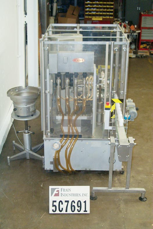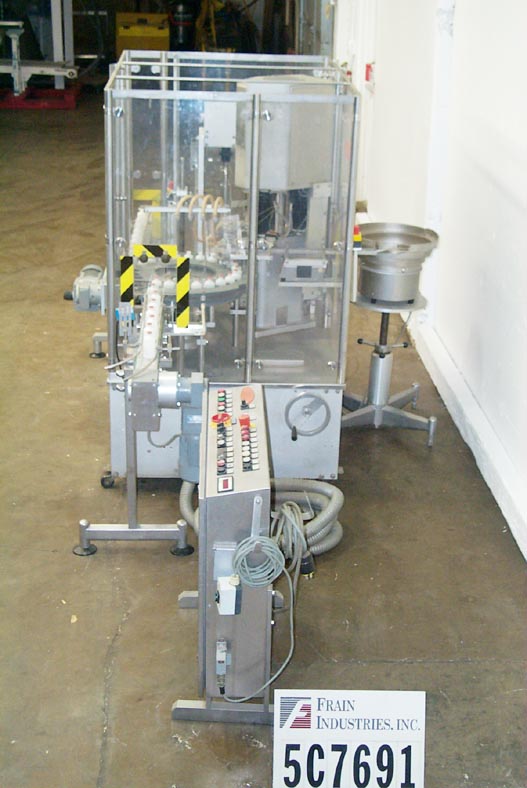 Bausch & Stroble型号KSF1020,自动旋转不锈钢,填料和塞机额定从10到60个容器每分钟-取决于材料和应用。灌装范围:高达540ml和容器:高达100mm直径;310mm玻璃或塑料高度,可处理普通和开槽式塞子(有适当的更换部件)。配备了96“长x 3-1/2”宽塑料Delran链集装箱输送机星形轮进料和出料(4)无阀活塞组件(4)3/16“OD喷嘴安装在24”长滑杆和17“直径振动塞料碗和加压站。遥控面板与启动/停止驱动,皮带,计量泵,止动器和星形轮控制与电子停止,安全保护和安装在不锈钢底座框架。