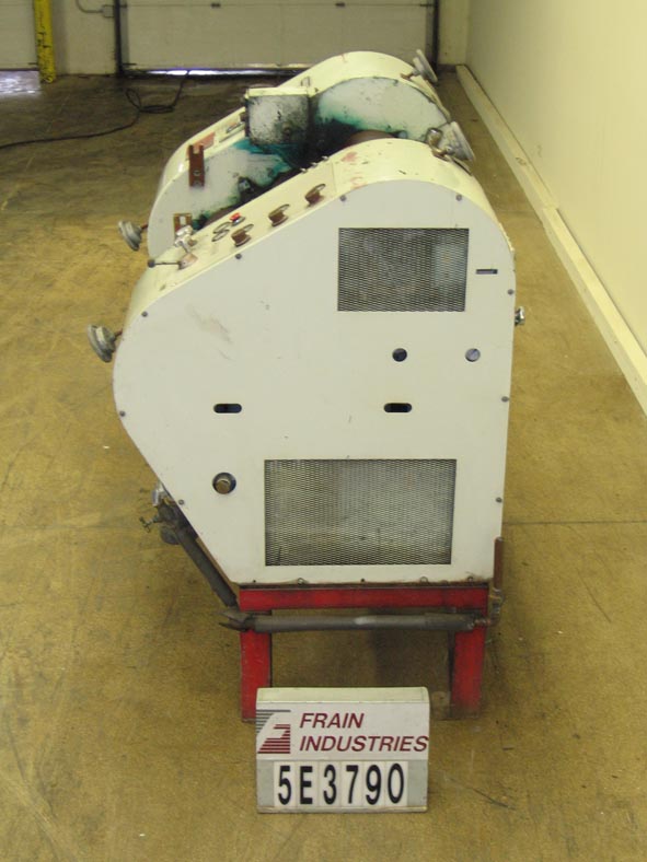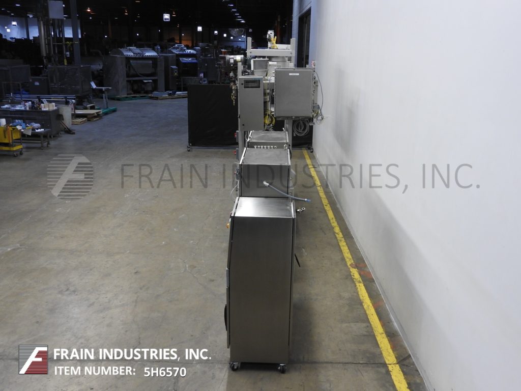 Frisse,型号UZM421, 16英寸宽,顶部和底部巧克力橡胶每小时的产品重量-取决于材料,应用和机器配置。通过enrober配备一个16½”宽x 71”长的不锈钢网带,(1)16¾”宽底部滚子应用器,(1)16¾”宽护套顶部滚子应用器,鼓风机,详细器,振动筛,带滑动和翻转安全门的架空加热器。系统包括一个容积式巧克力循环泵和带有(2)水泵的两区5000瓦水加热系统。控制面板带有按钮开关控制:搅拌,井底,振动,巧克力再循环泵,巧克力返回泵,窗帘搅拌,鼓风机和细节。控制面板还包括(3)温度控制:水区1,水区2和空气温度。
