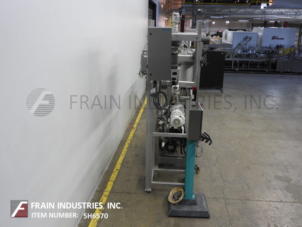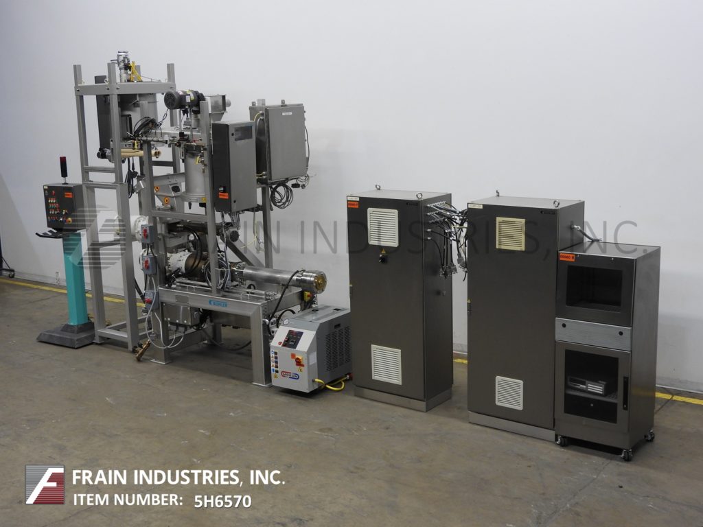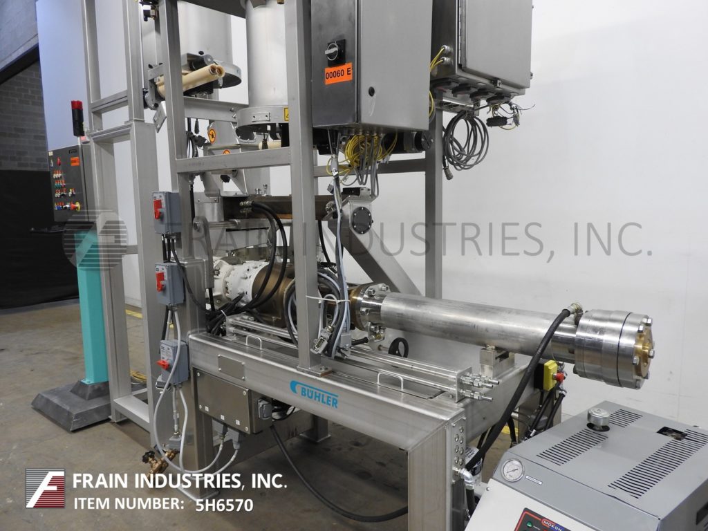 比勒麦格M-MN-400型,内联单螺杆挤出机,每小时的产量取决于材料和应用。配备产品分配者,进料斗与双36“长x 2”OD螺丝喂养58“长x 4-1/4”OD单螺杆挤出机与36“长x 4 1/2”OD单桶和份81/2“OD / 4 1/2”ID法兰最终产品卸货港与(6)3/4“螺栓孔上设置6”结算中心和36”地板。比勒麦格微量配料机用于微量成分的一致体积比例,如维生素,抗坏血酸,干面筋,蛋粉以及调味剂和着色剂,这是喂入双螺杆分料部分,喂给单螺杆挤出机。远程控制面板主要有A / B CPU和独立控制器手册,汽车、汽车清洁标准和名义运行,混合捏和机和搅拌机捏和机向上/向下,按螺旋填补水管,定量给料器开/关开关紧急停止和紧急停止复位控制和个人温度控制器和Mokon热水器。全部安装在单独的框架上。