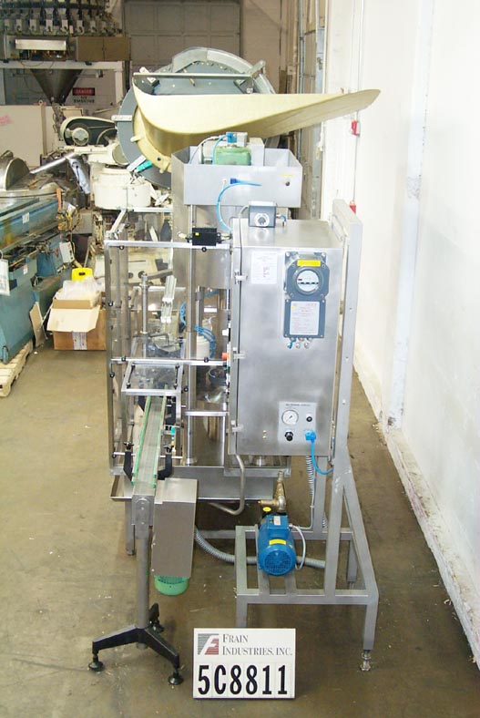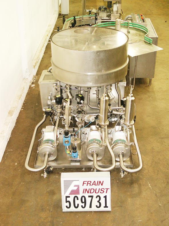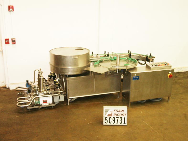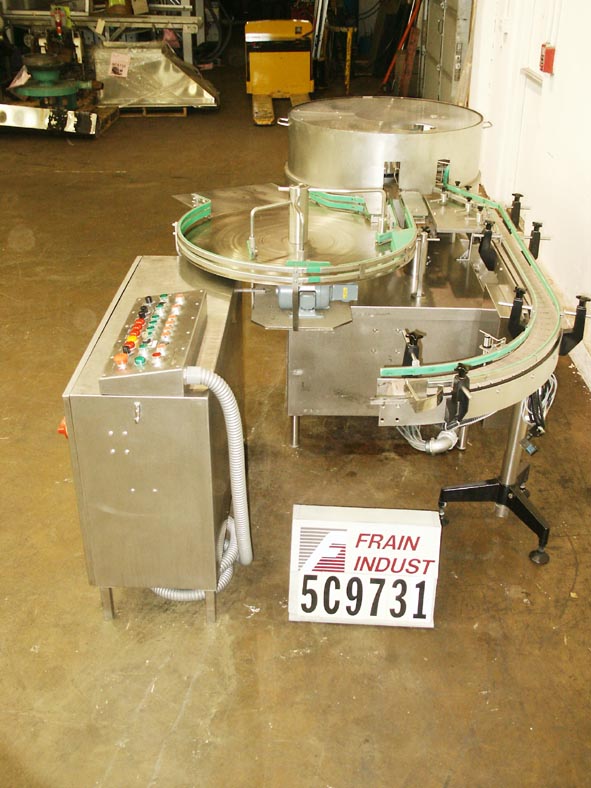 Calumatic型号CRW-TP28,自动,不锈钢,旋转,瓶垫圈额定从720到1800瓶每小时-取决于材料,应用和瓶的大小运行。小瓶尺寸范围:直径14mm至80mm;高度高达177mm。小瓶从36"外径整理器传送到进料站,在那里它们被倒置,通过10头洗涤站,然后在出料站向上。控制面板有按钮控制启动,停止和e-stop。安装在不锈钢框架上。