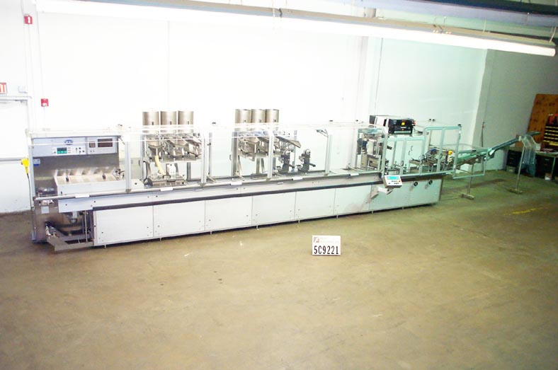 Automatic Blister former rated to 40 Cycles per minute. Web width: 256mm Forming depth: 12mm Index:180mm. Film gauges from 150 – 400 micron. Gauges from 15 – 30mm. AB SLC 5/04 PLC Equipped with the following optional upgrades: Gotscho 12-10 platen printer, Nimax VD95P tele-camera inspection system. Extended bed to accommodate up to 6 feeders (3 brush box, three dedicated). electric machine pitch adjustment with display, base material splice table, 6 product pre-feed hoppers, lidding material splice detection with reject, lidding foil registration, intermittent motion vertical perforation for lengthwise, crosscut or both perforation, complete pvc/alu format turning device for coated/uncoated oblongs, discharge belt connection to cartoning machine.