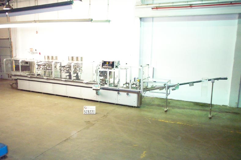 Automatic, intermittent motion, hot melt, horizontal cartoner capable of speeds from 10 to 40 cpm – speeds depending on materials and application. Carton size range: 1/2" to 3-1/2" in Length; 1/2" to 2-3/4" in Width; 2" to 8" in Depth. Equipped with a 144" long powered carton magazine feeding a reciprocating pick and place with blade style carton erector. 5-1/2" long x 2-1/4" wide x 1-1/4"high adjustable product buckets with no product no carton detection probe, set on 4.75" centers. Single arm product pusher, flap closers, Nordson two gun hot melt glue system A/B plc with swing arm controller and interlock safety guarding.