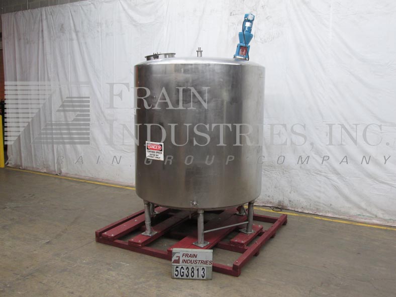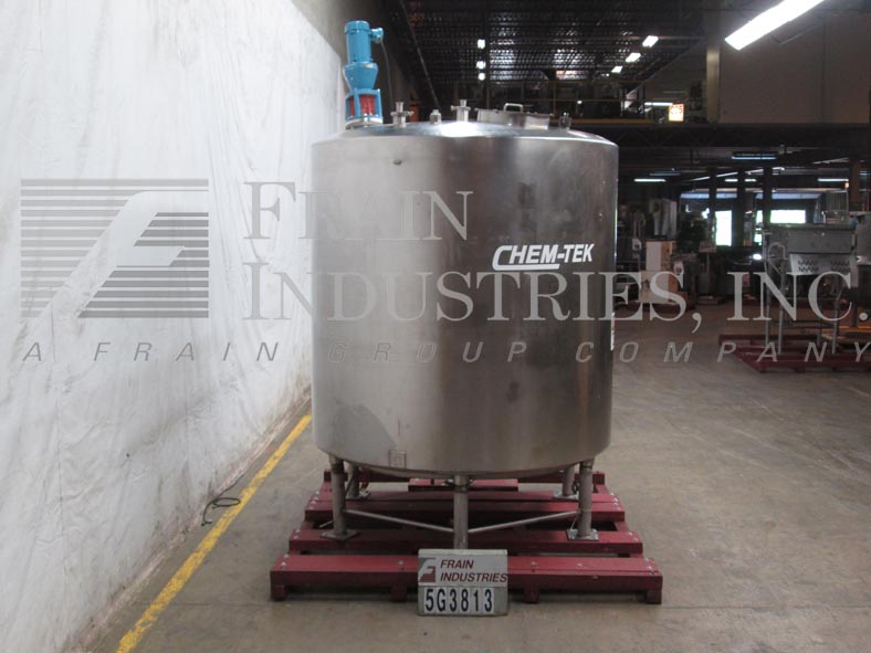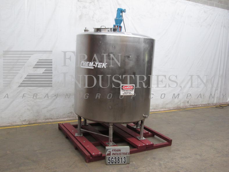 Chem Tek,型号OVS,1000加仑,不锈钢,单壁混合罐。62“直径x 80”直墙。配有平坦的顶部,侧面贴装搅拌支架,带3/4 HP双支链灯亮型搅拌机。倾斜底部有2“ID,2.5”OD卫生侧底部放电,32“落地间隙,并安装在(5)不锈钢臀部腿上。