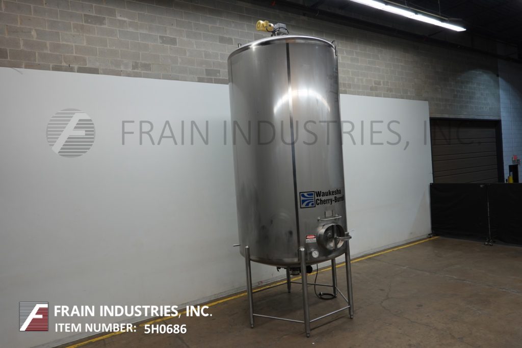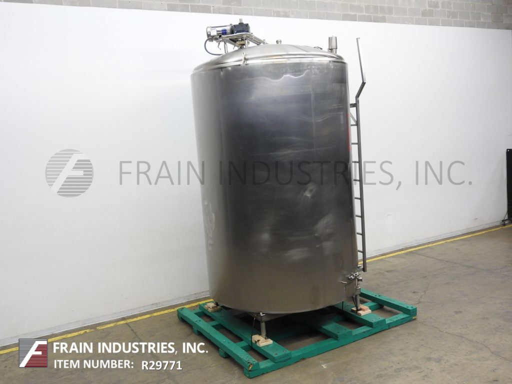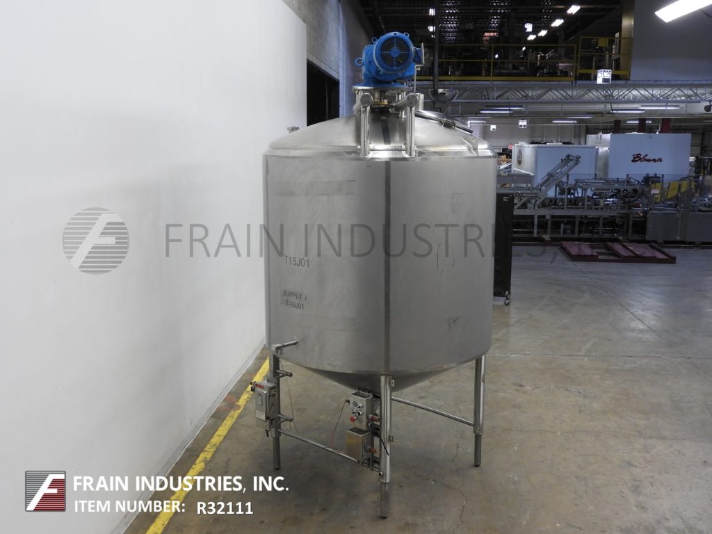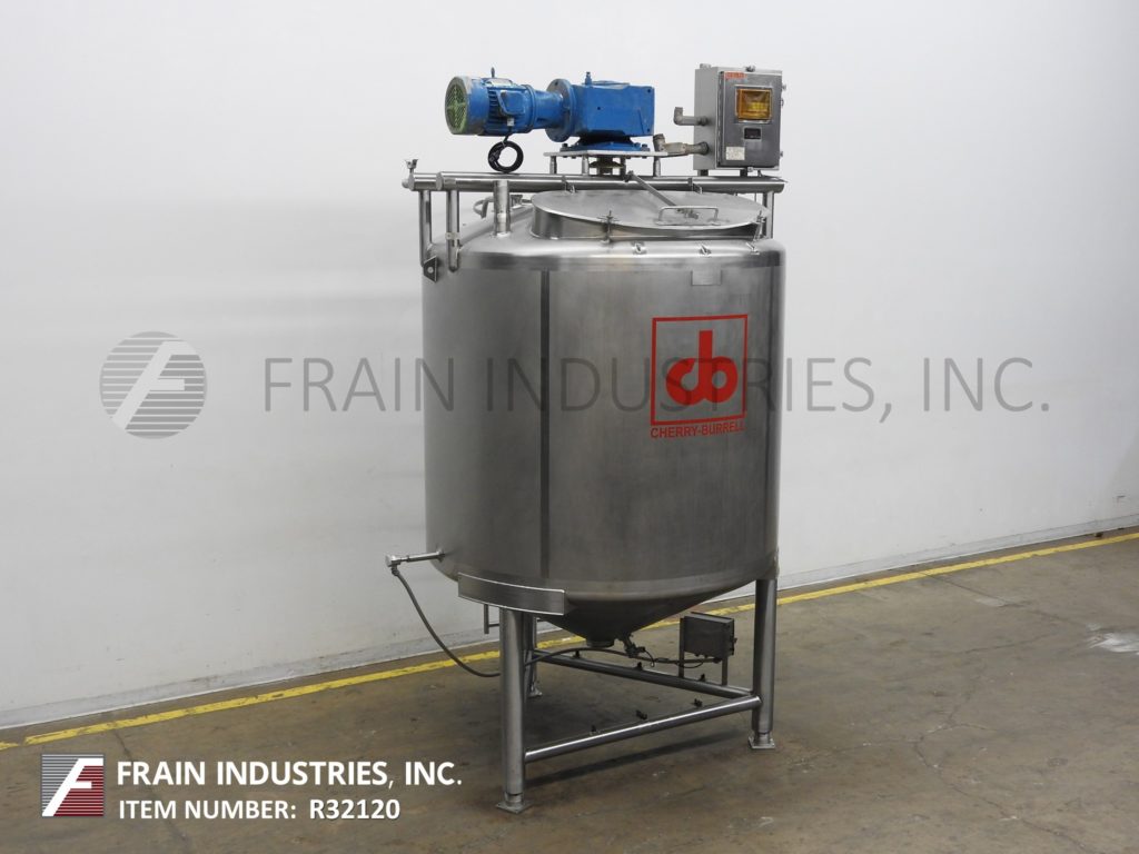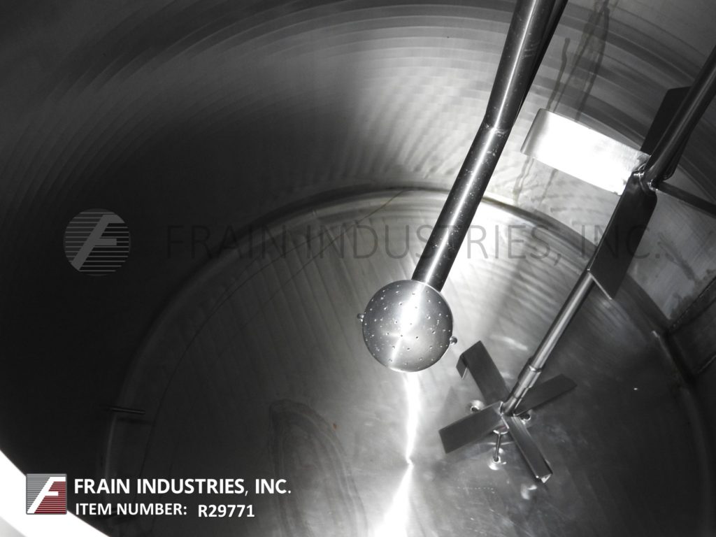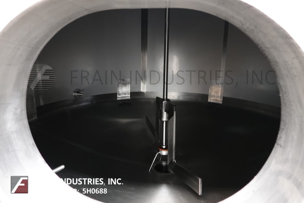Cherry Burrell 1000加仑,316不锈钢,单壁加工槽。容器尺寸:72"内径x 60"直壁。配备一个7½Hp顶部桥式扫描搅拌器,48" x 20"人路,10"宽x 50"长可调节挡板,(1)热电眼和(1)冲洗安装传感器。锥底具有5¾”外径/ 4¾”ID三夹板中心卸料,地面间隙为22”。安装在(3)腿架上,带有侧梯。