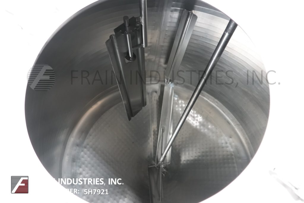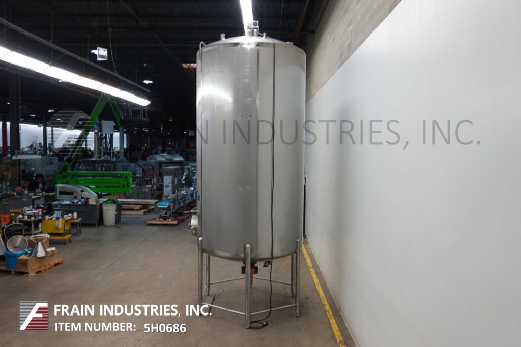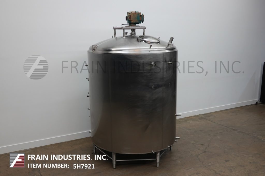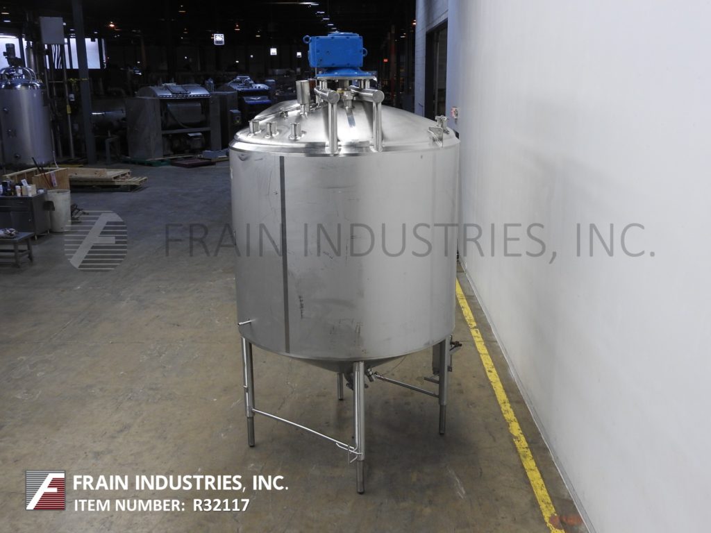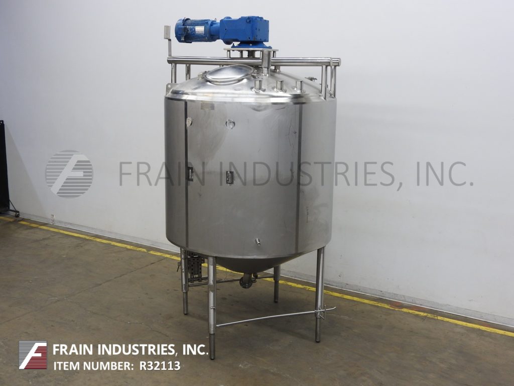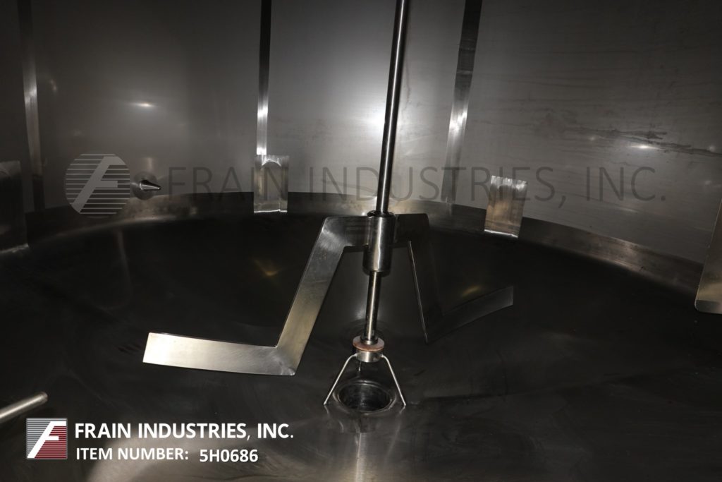 樱桃卷发1000加仑,304不锈钢,绝缘加工罐。容器尺寸:72"内径x 60"直壁。配备了两种速度5 /2½HP顶桥安装扫描搅拌器,20英寸直径通道,(2)热电偶套管和(1)冲洗式安装传感器。锥形底部有4½“OD / 4”ID Tri-Clamp中心放电,20“地面清关。安装在(4)腿框架上。