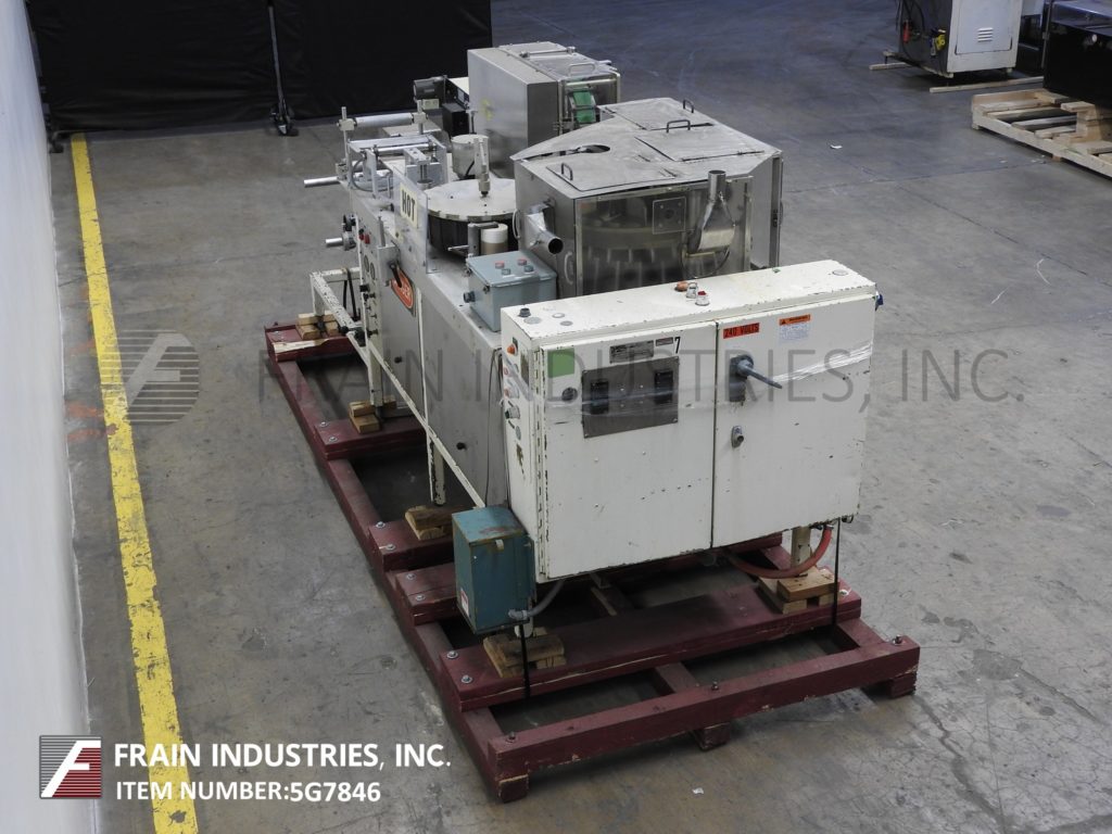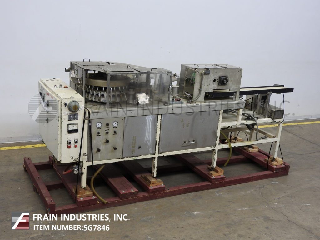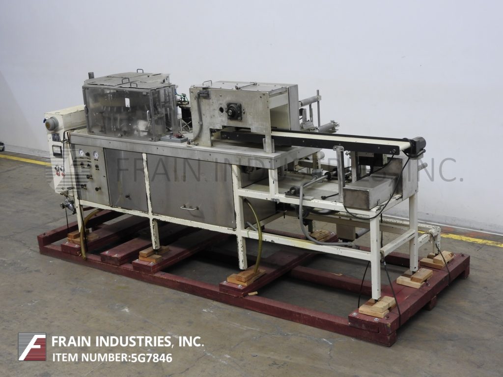 云式,SC24型,卧式,不锈钢,连续运动,成型/充填/封合机。每分钟100到800袋-取决于材料和应用。设置在2-(7/8)“固定中心胶片辊。袋是由卷筒材料称为网络就是从辊通过web纵向形成犁,折叠形成一个育儿袋web地带然后包装周围180度加热封转鼓机目前在2 -(7/8)“中心垂直热封口web地带,真空转移轮将腹板带到24站旋转粉末或颗粒填料,填充的腹板带,然后通过9英寸长的顶部热封棒,到旋转刀轮,将腹板带切割成单独的袋和8英寸宽x 50英寸长的排出输送机。