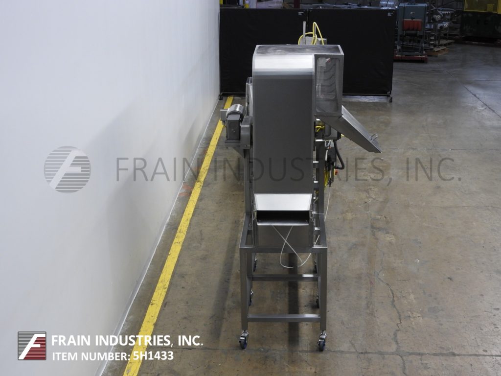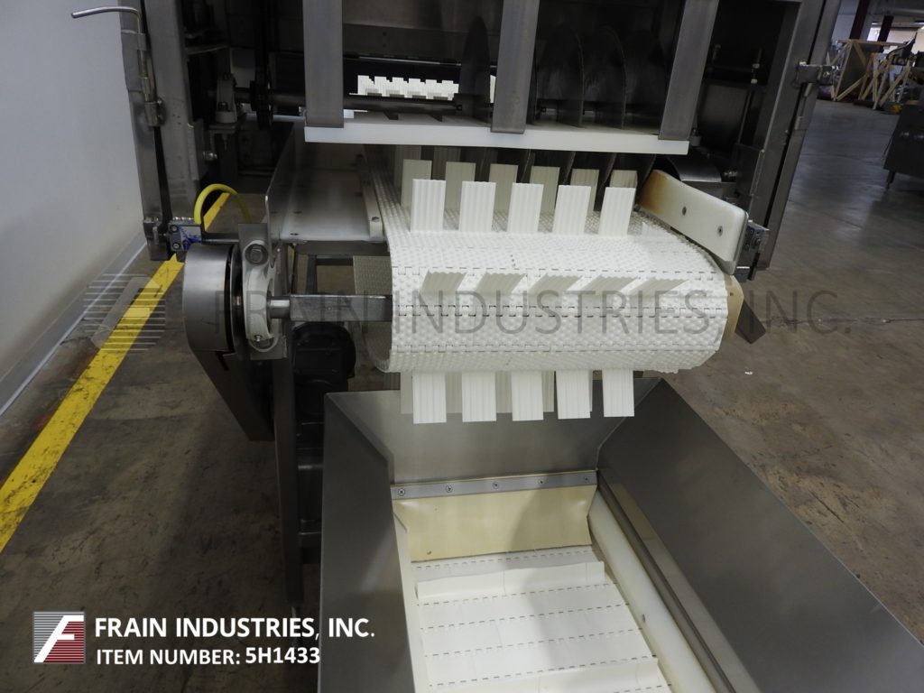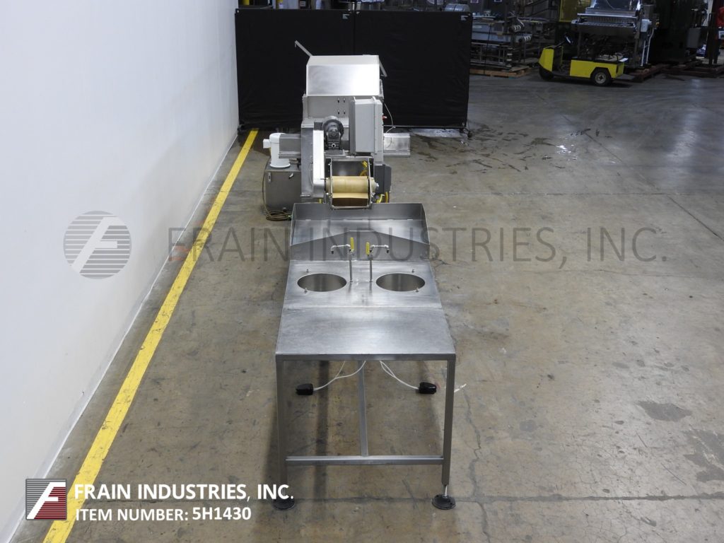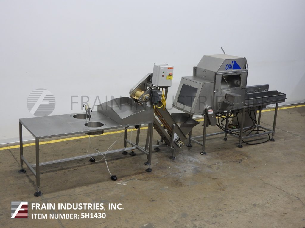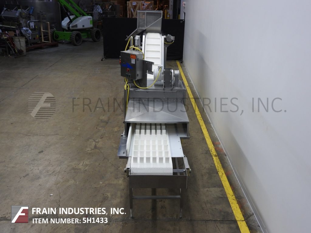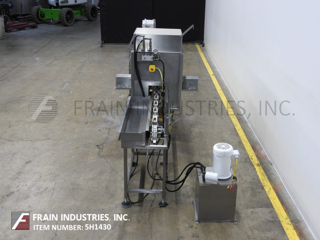 CMI设备,精密修剪器,用于顶部和拖尾。每分钟20至65计数,每小时容量超过3,000磅 - 取决于材料,应用,机器配置和操作员灵活性。配备48英寸长的负载区域,产品持有者设置在10英寸的中心,自动调节刀片,顶部按住阀门,通过切割头部,由5 HP液压包装提供动力。切割器进入10英寸宽的X 55“长夹板倾斜输送机,其中2”高夹板设置在8“中心,由½HP驱动器提供动力。进料器用(2)操作员站排出78“长×36”宽不锈钢清洁台,每个操作员站有脚踏板操作的空气Blase和12“直径废料。