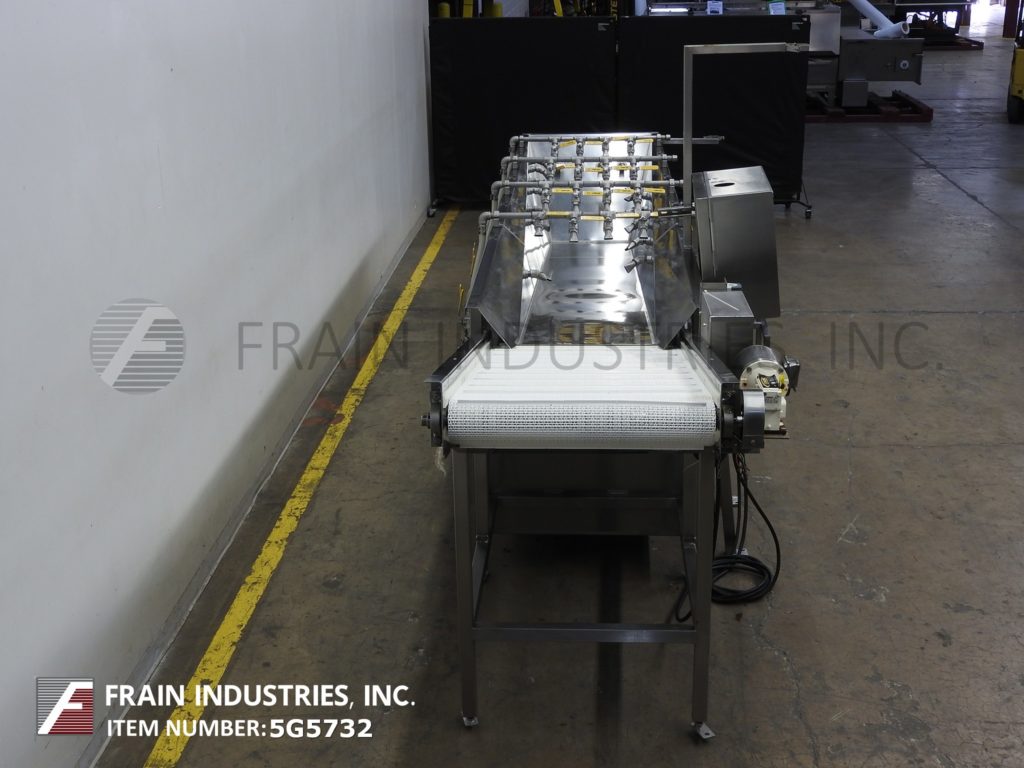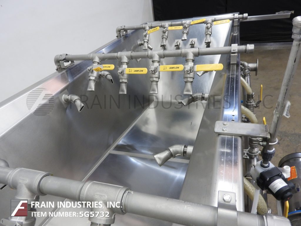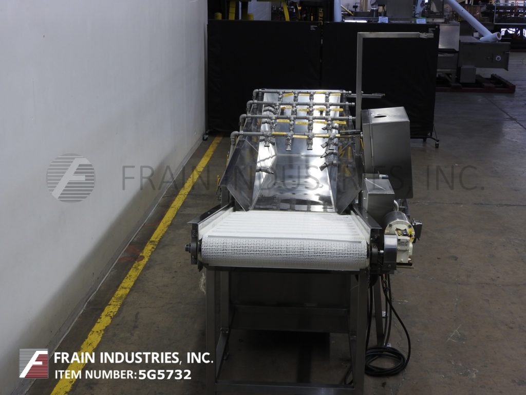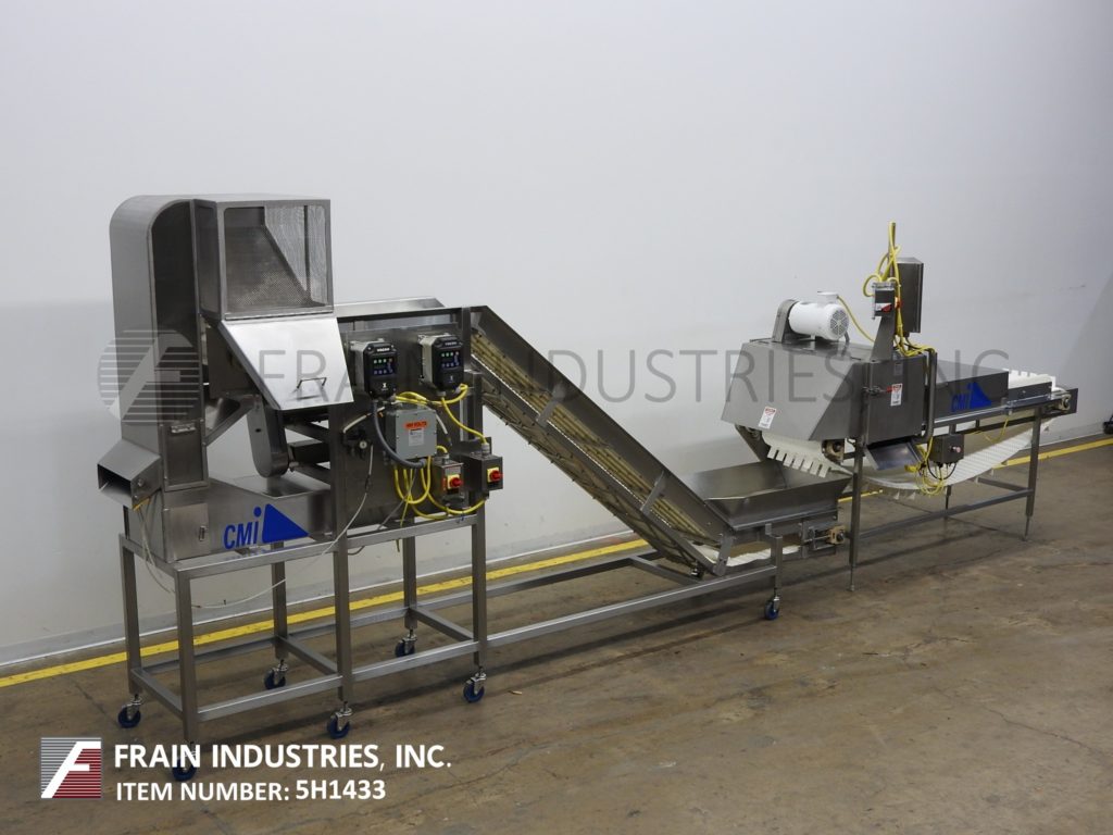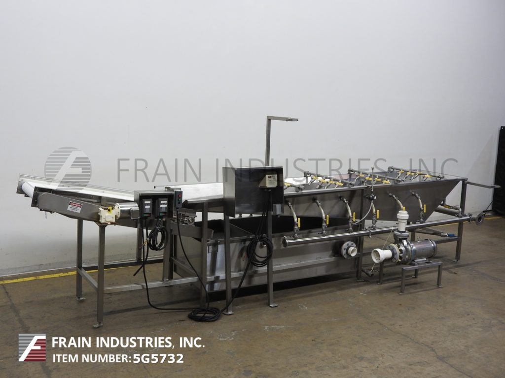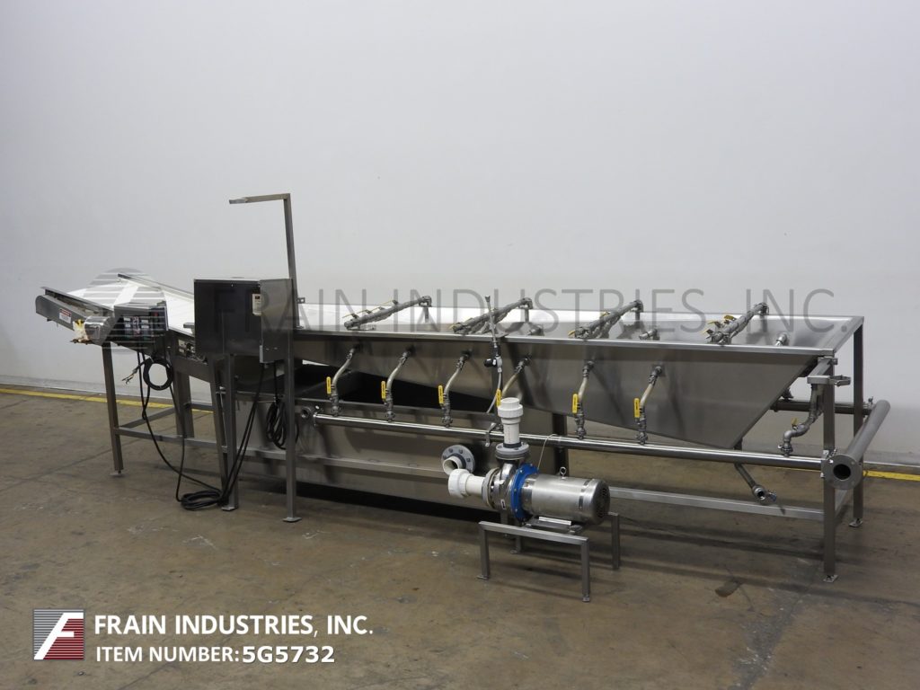 CMI设备与工程公司,MNL型不锈钢,槽式,高功率,多喷嘴蔬菜喷雾清洗机,每小时产品磅数-取决于材料和应用。配备180英寸长x 32英寸宽x 28英寸深的进水至3英寸深的排水口,倾斜底部冲洗槽,带135英寸长x 3-1/2英寸外径螺纹侧供水管和1-1/2英寸末端底部排水口(16) 顶部,(11)在一侧,(6)在另一侧和(4)端部,2”宽的高功率喷雾凹槽各有其单独的调节控制杆。67“长x 30-1/2”宽柔性连接倾斜夹板脱水输送带,带1/2”高夹板,设置在6”中心至底部93“长x 35”宽x 26”深的不锈钢回流池,带10 Hp离心泵。控制面板具有启动、停止、按钮和速度控制旋钮。安装在不锈钢底座上。清洗水果、萝卜和绿叶沙拉蔬菜的完美方法,如芹菜、花椰菜、花椰菜、菠菜、萝卜、罗马菜和春季混合菜。