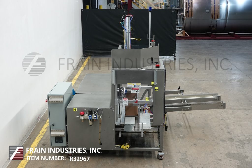Combi,型号TBS-100 FC-XL,自动,均匀,顶部襟翼闭合器,顶部和底部箱胶带封口机。额定值为每分钟10至20箱-取决于材料和应用。外壳尺寸范围:8英寸至24英寸长;宽度为6英寸至16英寸;高度为5英寸至18英寸。配备72“长x 2-1/4”宽的双面皮带箱辅助输送机、自动顶部翻板闭合器、主要/次要翻板犁、2”顶部和底部胶带头、带联锁lexan安全防护门的手动曲柄可调。控制面板具有按钮启动/停止/复位和紧急停止按钮控制。安装在(4)支腿高度可调框架上。