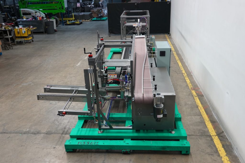 Combi America型号2EZHS,自动,机箱安装机,底部热熔胶封口机。外壳尺寸范围:8英寸至24英寸长;宽度为6英寸至16英寸;高度为5英寸至18英寸。配备57“长箱盒,(5)吸盘pic-n-place,小和大活门闭合器,48”长双面皮带箱分度,非工具可调,真空系统,Siko仪表,Nordson ProBlue热熔胶系统和联锁安全防护装置。带面板视图、安全复位、启动、停止、紧急停止和状态灯条的A/B控制器。安装在脚轮和水平腿上。