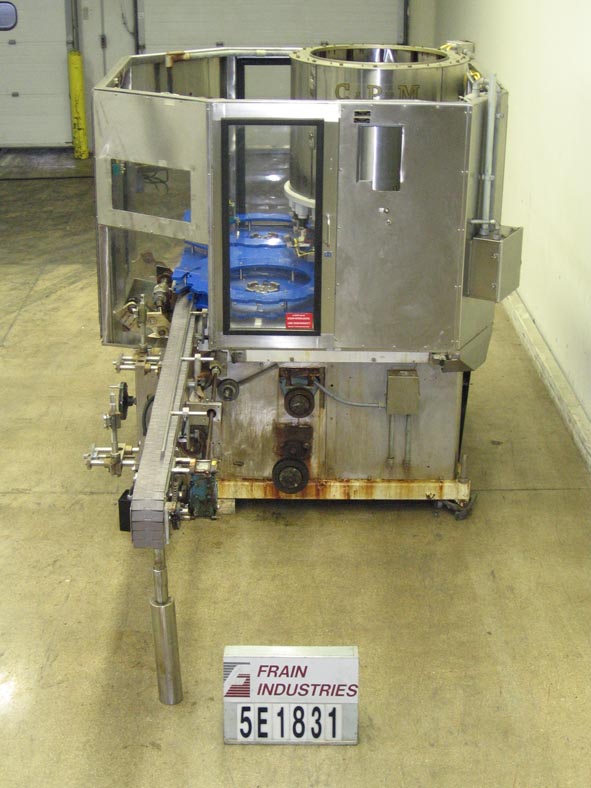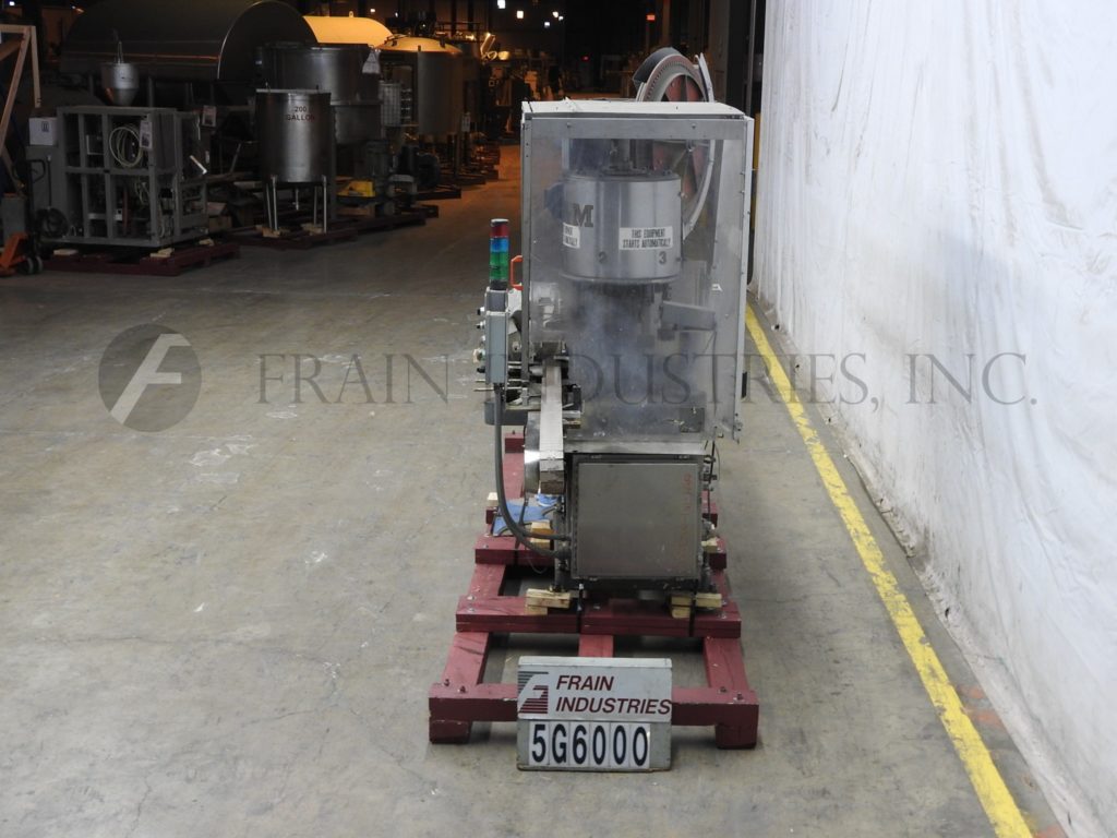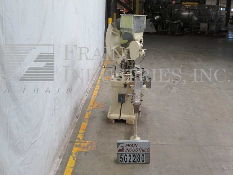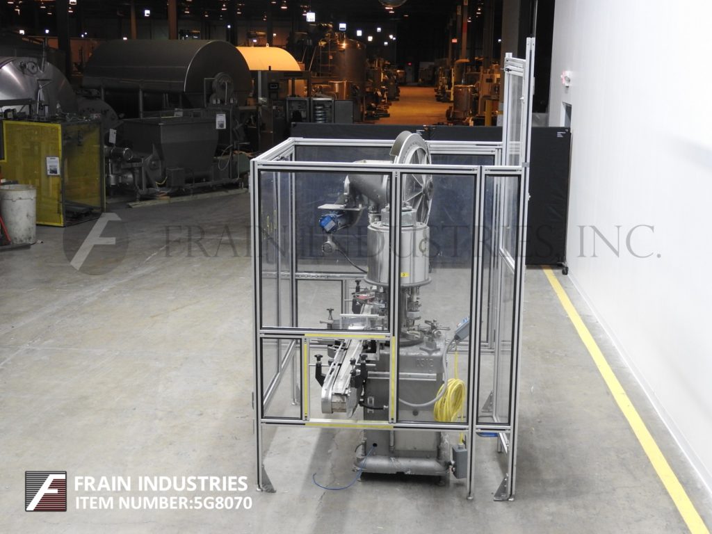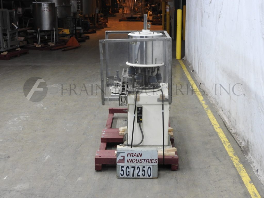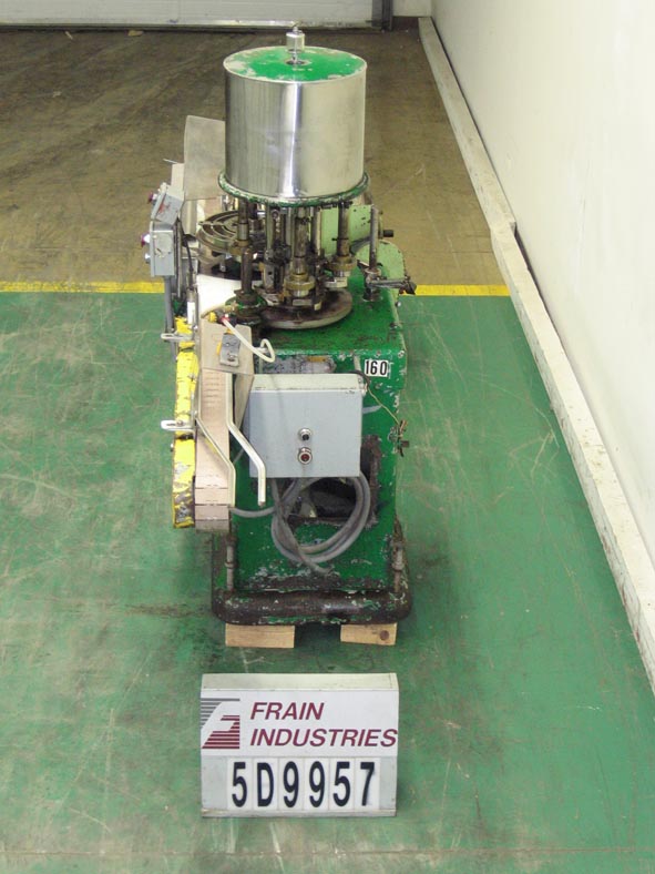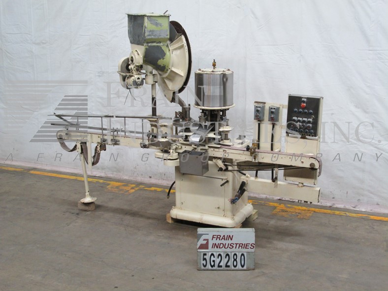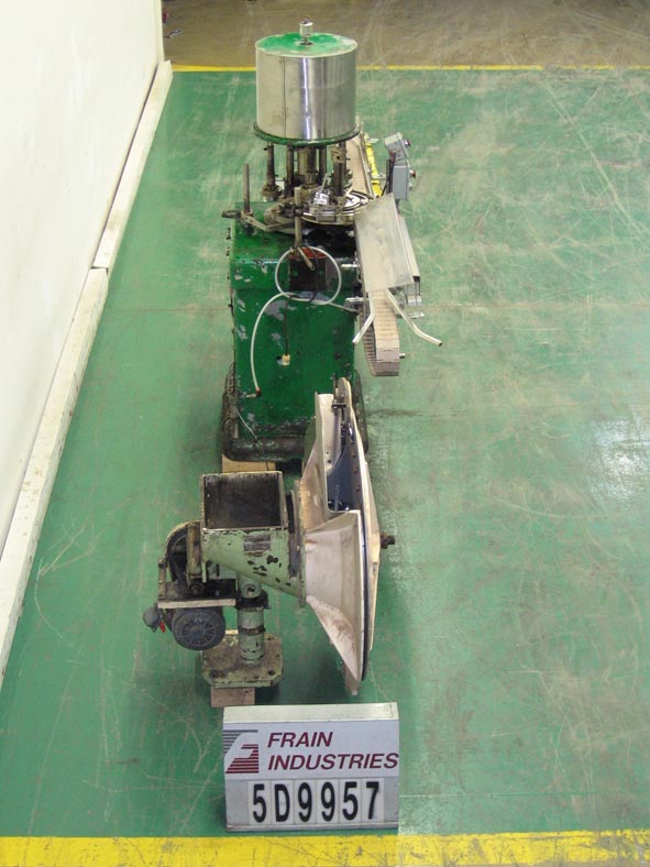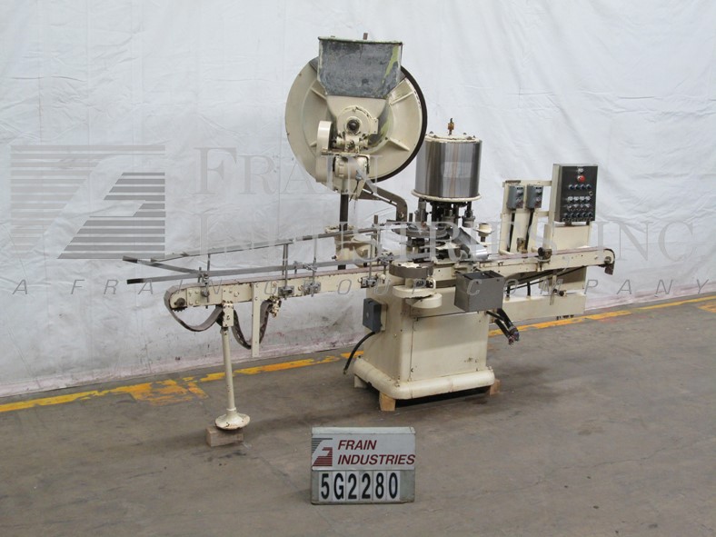 合并型号D6F,自动,6个头旋转卡盘夹,每分钟24到180个容器 - 取决于材料和应用。帽尺寸:高达100毫米。容器尺寸:直径最多5英寸(具有适当的变换部件)。配备盖帽,圆盘盖分拣机,用帽子拾取。96“长x 2-1 / 4”宽集装箱输送机,带32英寸长蠕虫螺钉进给星形排放,没有容器/无帽,带有(6)扭矩的旋转炮塔与炮塔安全防护。安装在重型基础框架上。