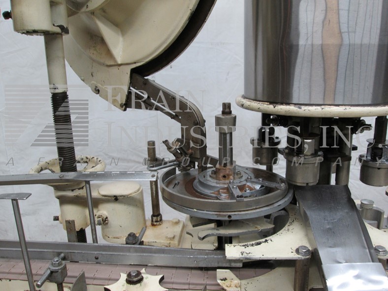 固定式,C-4-F型,自动,4头旋转卡盘压盖机,带盖分选机和给料机。额定每分钟40到120个容器-取决于材料,应用和机器配置。最大瓶盖尺寸:高达89毫米,最大集装箱高度:12",最大集装箱直径:3½"。适当更换零件。配备了一体化的瓶盖给料器和料斗,配有圆盘整理器,瓶盖滑槽和按钮,116“长× 3¼”宽皮带输送机,在进料和出料中有星形轮,无容器/无瓶盖和(4)扭矩开启卡盘盖头设置在8½”中心,双抓斗集装箱处理。控制面板有按钮启动/停止。安装在底座框架上,并配有安全防护笼。
