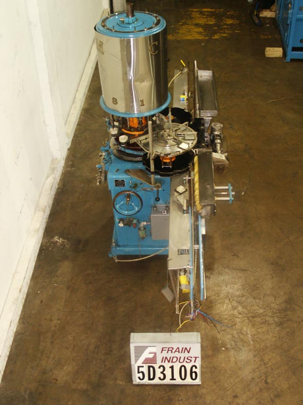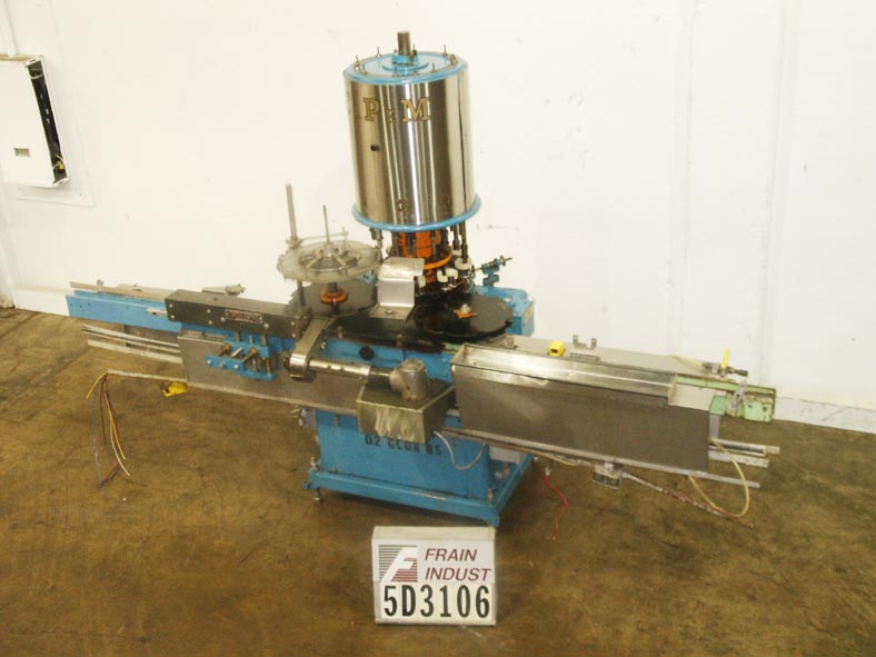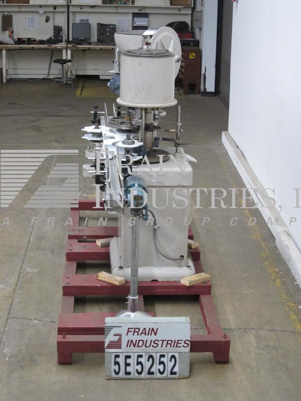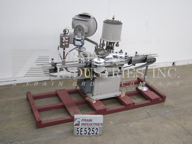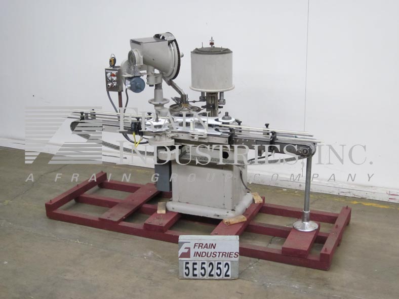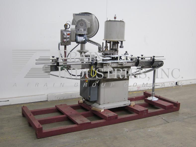 综合模型D-4,自动,2头旋转,卡盘压盖机额定从10到60个容器每分钟-取决于材料和应用。瓶盖尺寸范围:高达89mm。容器尺寸范围:直径可达6-1/2";和高达12英寸的高度与适当的变化部分。配备96英寸长x 3-1/4英寸宽德林皮带输送机,24英寸蜗杆到星轮进/出料,24直径帽分选轮带料斗。控制器与机器启动/ e-stop,慢跑,帽给/帽供应控制和安装在重型基础框架。