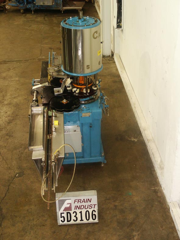 综合型D6FA,自动6头旋转卡盘封盖机额定从24到180个容器每分钟-取决于材料和应用。瓶盖尺寸:高达70mm,容器尺寸:直径达5英寸(适当的更换部件)。配备帽分拣饲料与饲料溜槽,帽挑选到位,72"长集装箱进料输送机与32"长时间螺丝,星轮,集装箱夹具,无集装箱帽卸料溜槽,星轮卸料,和一个36"长的卸料输送机。