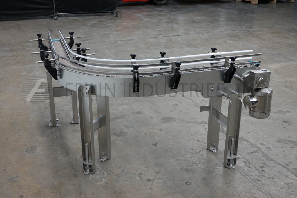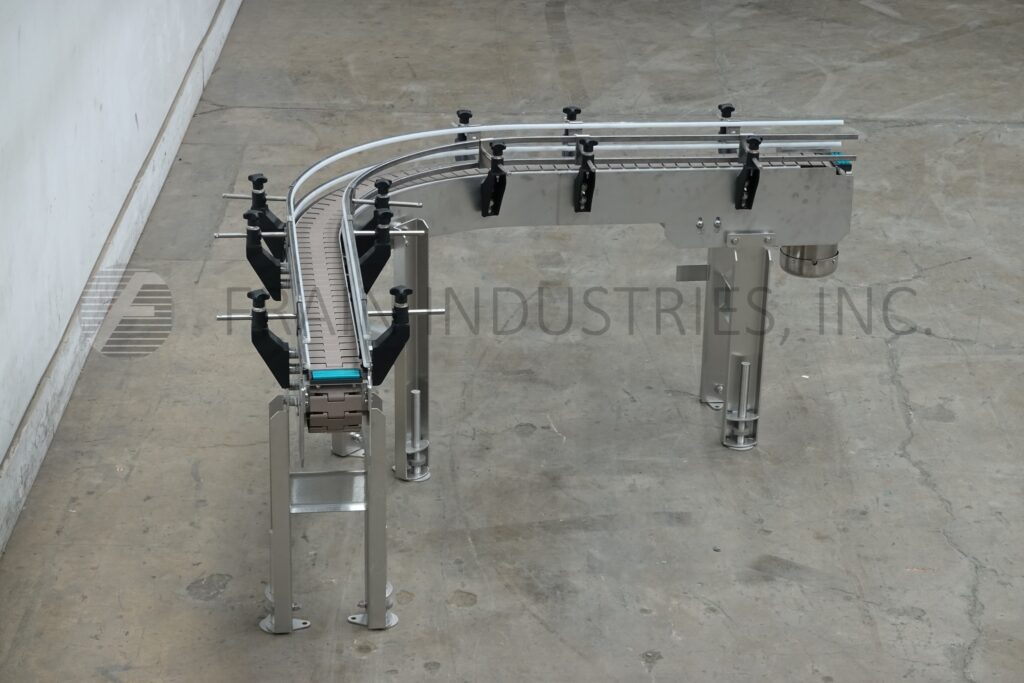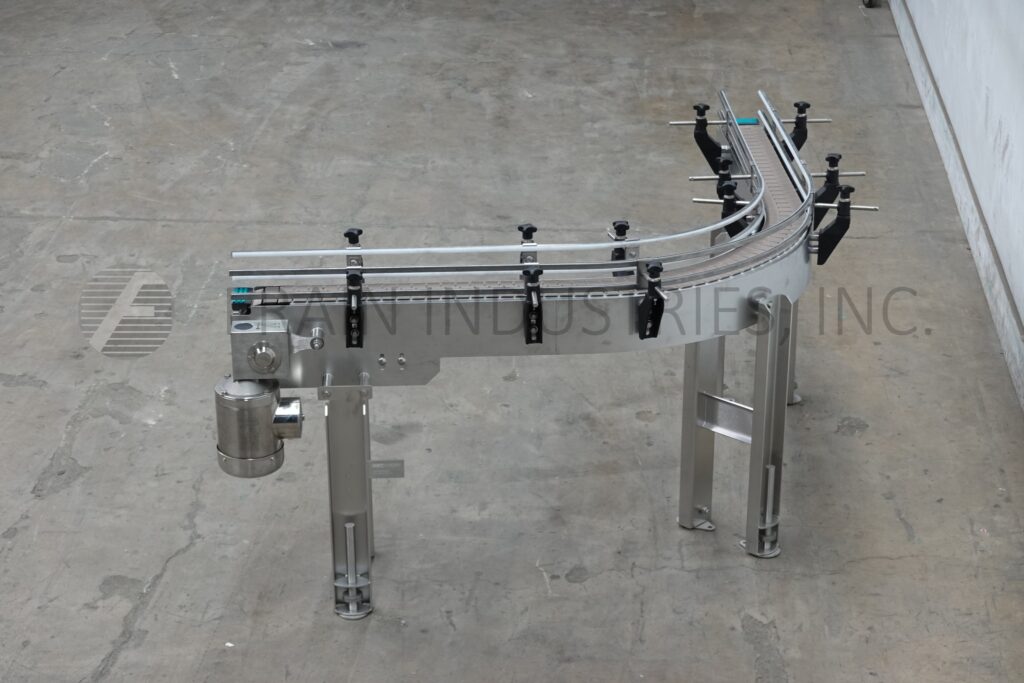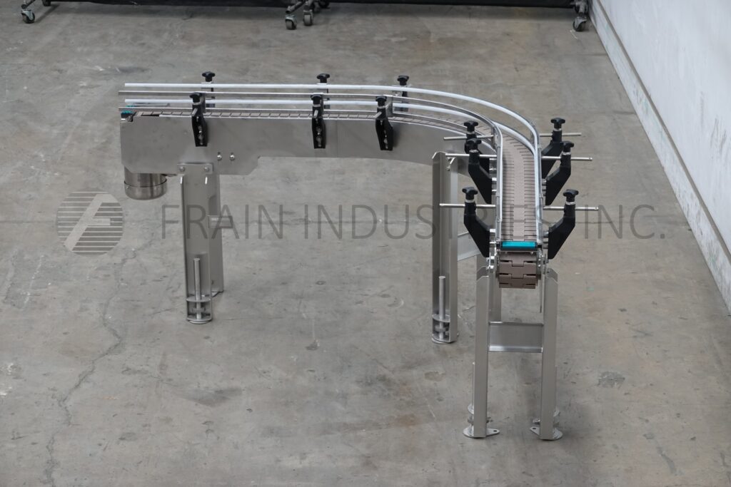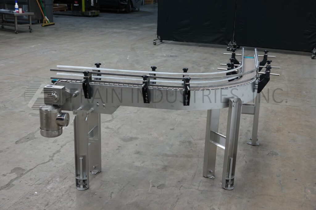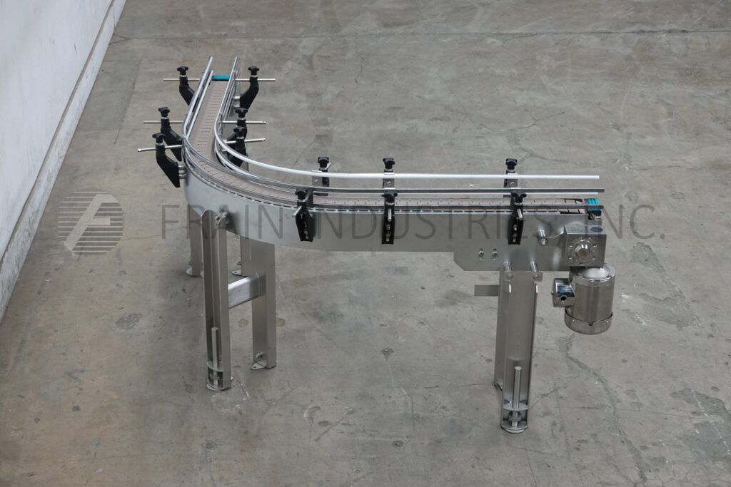 Custom Cut Metal, Model CCMM015792, 90° stainless steel frame conveyor. Equipped with a 4½" wide belt, 48" long infeed to 90° right hand turn to a 48" long discharge with a 33" – 38" infeed / discharge height range and powered by a ½ hp drive.
