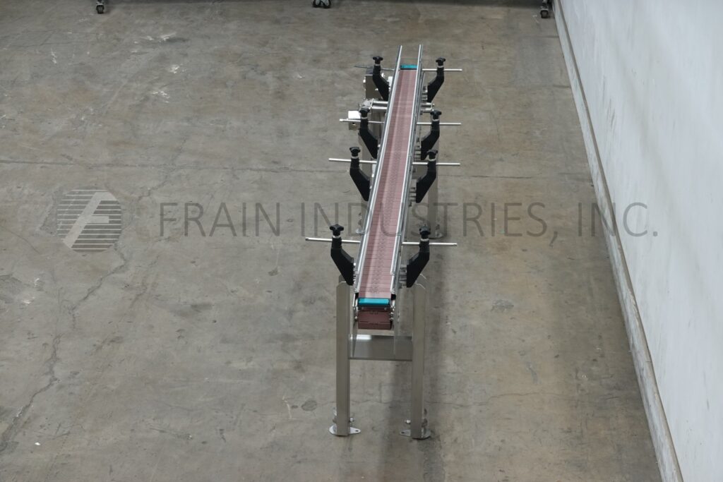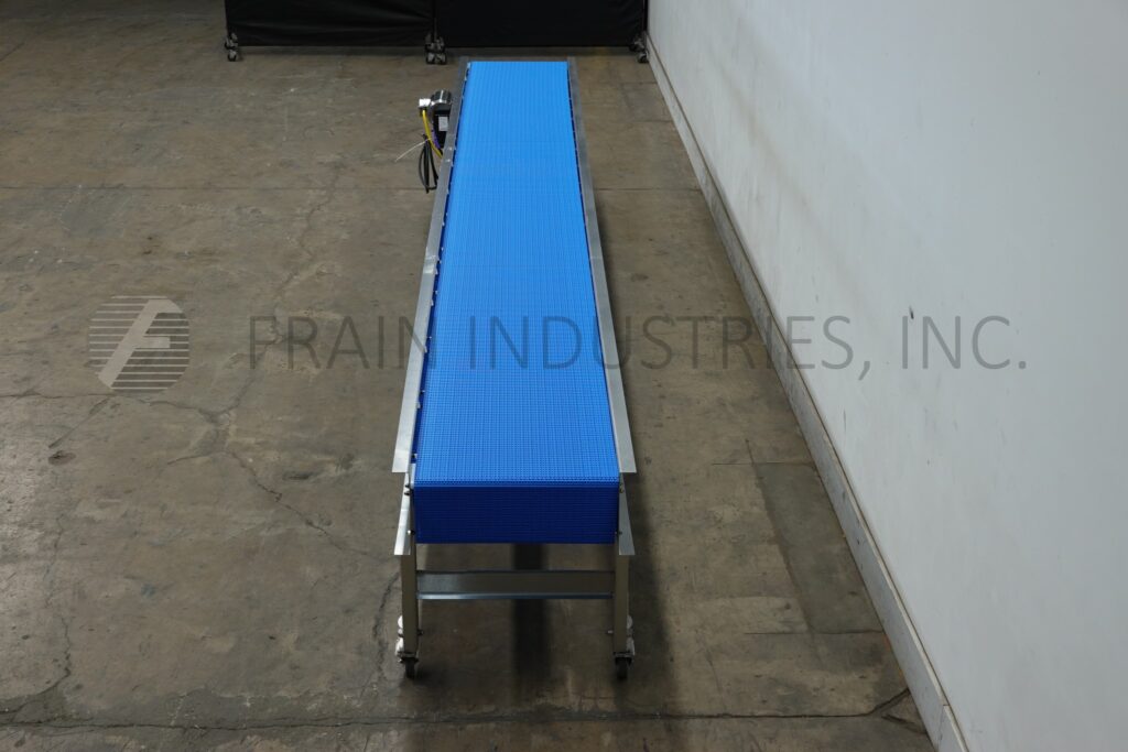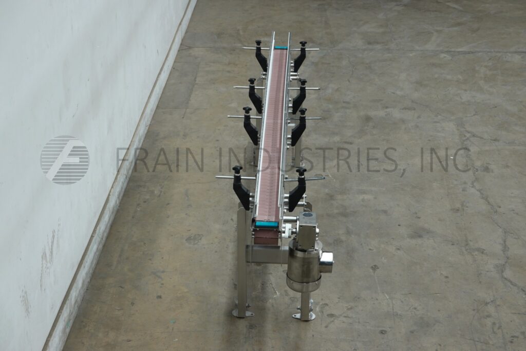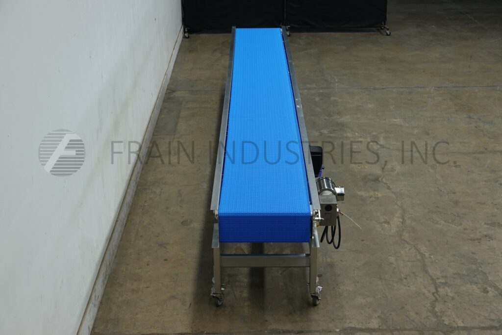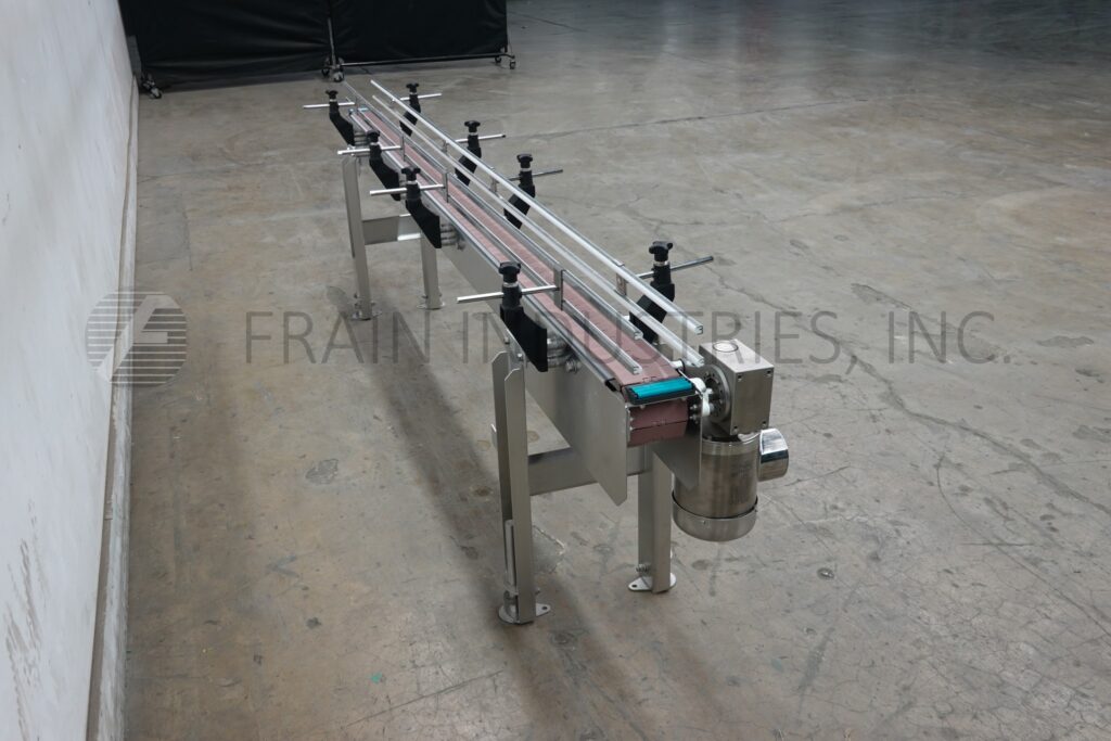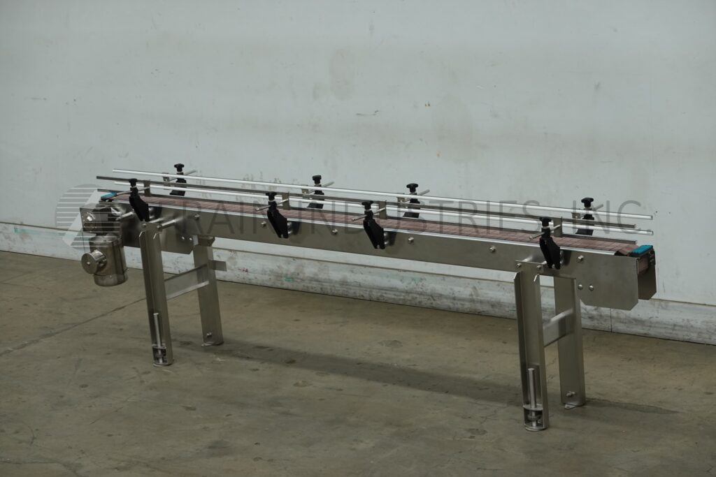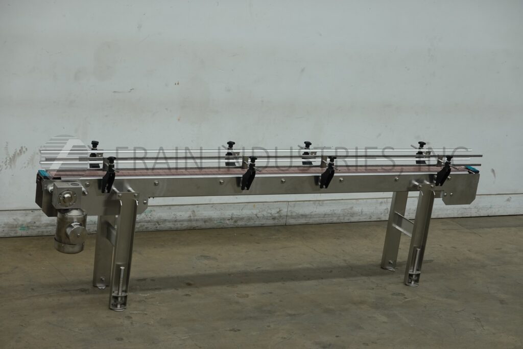 Custom Cut Metal, Model CCMM015792, 90° stainless steel frame conveyor. Equipped with a 4½" wide belt, 48" long infeed to 90° right hand turn to a 48" long discharge with a 33" – 38" infeed / discharge height range and powered by a ½ hp drive.