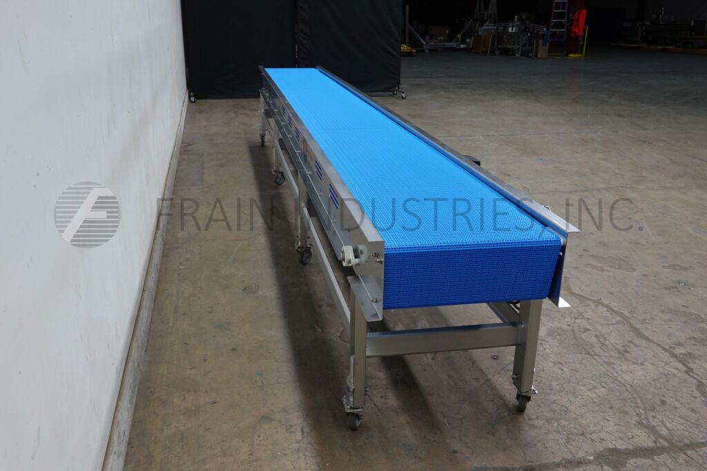 Custom Cut Metal, Model CCMM013886, stainless steel frame conveyor. Equipped with a 24" wide x 240" long belt with a 34" to 38" infeed / discharge range.