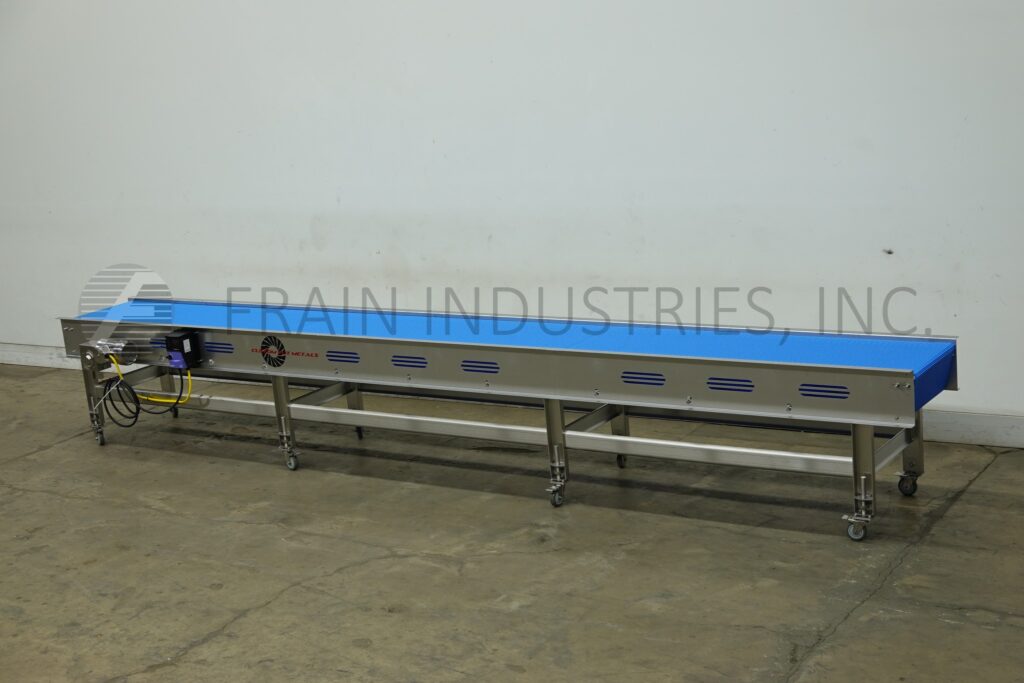 Custom Cut Metal, Model CCMM015423, stainless steel frame conveyor. Equipped with a 4½" wide x 112" long belt with a 30" to 35" infeed / discharge range.
