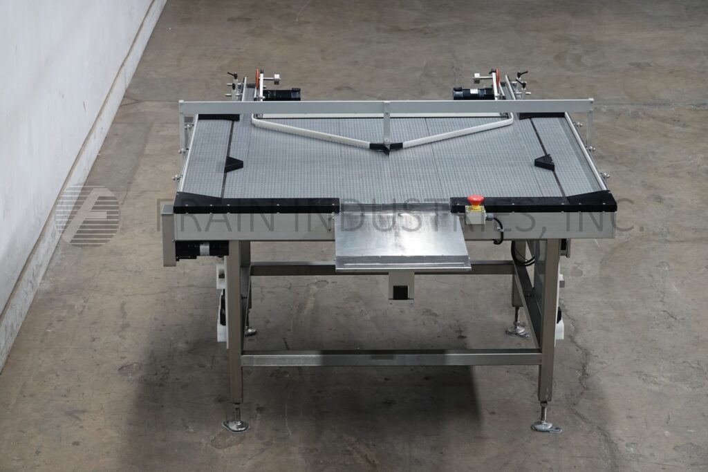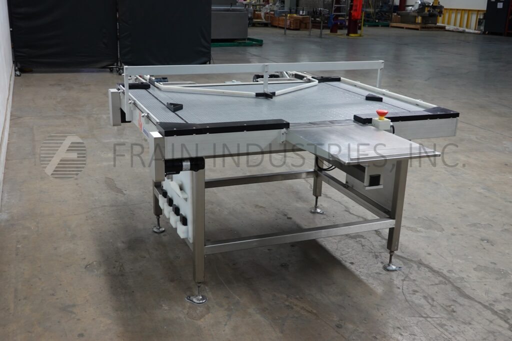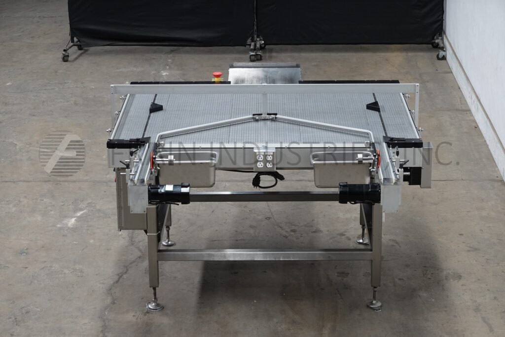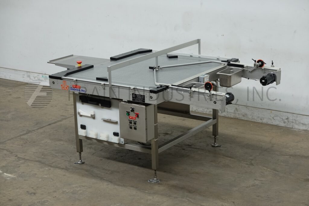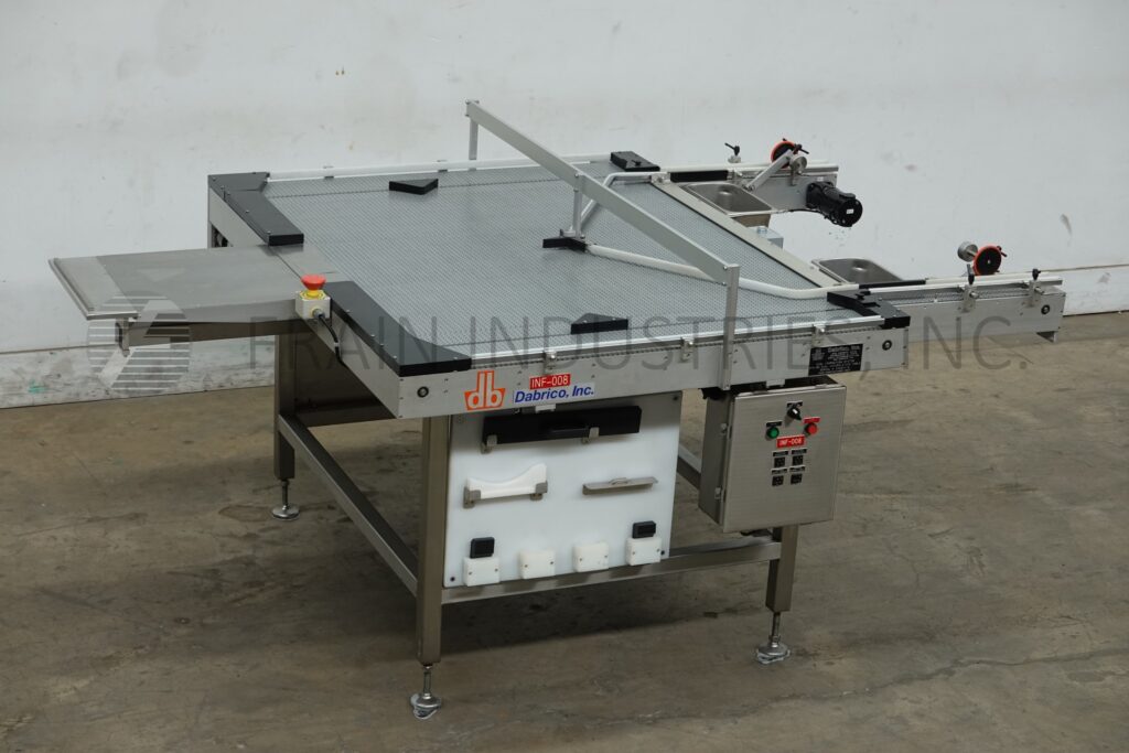 Dabrico, Model DFD 50, stainless steel, table top belt unscrambleing acummulation conveyor. Equipped with a 18" long x 22" wide platform, (3) 15" wide x 46" long conveyor, (2) 6" wide x 46" long accumulation belts and (2) 3" wide x 68" long discharge belts. Mounted on a stainless steel base frame with height adjustable legs for an infeed / discharge range of 36" to 40".