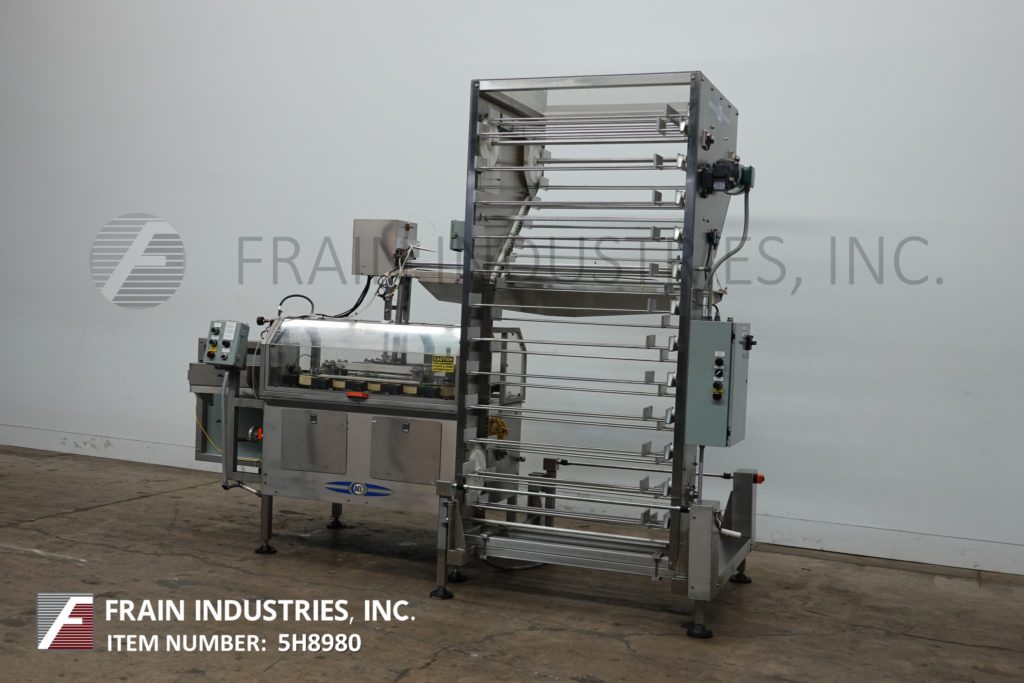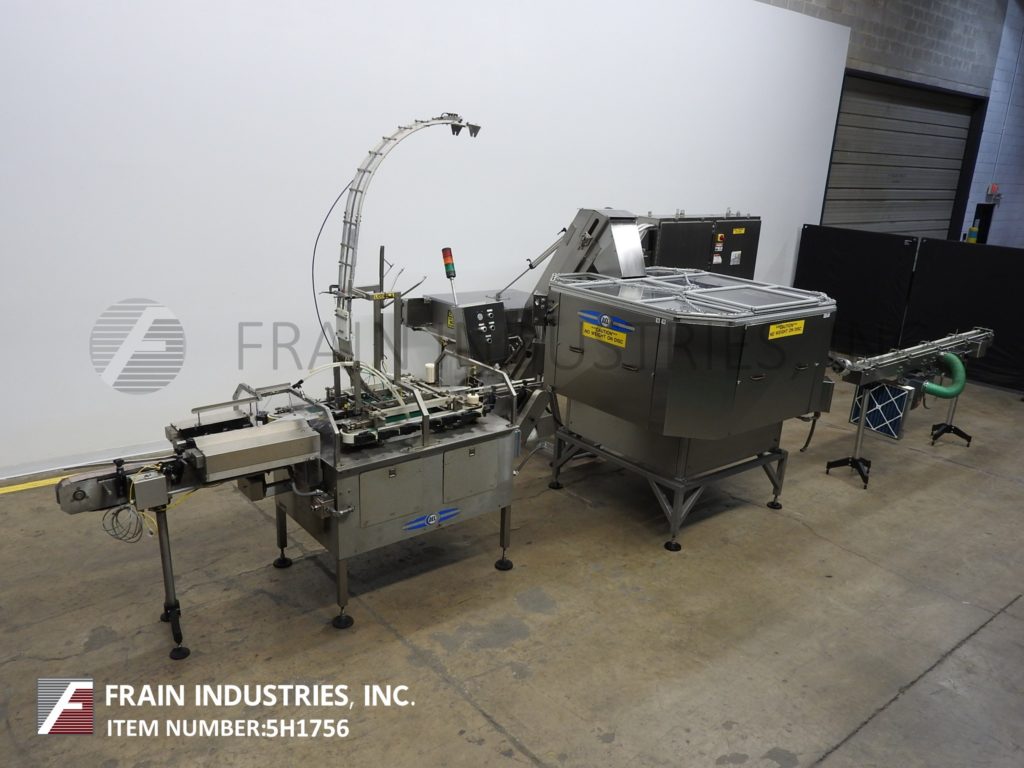 德l Packaging, Model ASRL-CC-401, automatic, stainless steel, inline overlidder with inclined cleated and centrifugal feeders. Rated from 50 to 300 containers per minute – depending on materials, application and machine configuration. Container size range: 2" to 7" in Diameter; 2" to 12" in Height with proper change parts. Equipped with stainless steel incline cleated feeder with 46" long x 40" wide x 40" deep stainless steel product hopper and pnuematic plastic lift up cover with 96" long x 11-1/2" wide inclined cleated belt with 2-1/4" high cleats on 8-1/2" centers to 60" OD rigid disc high speed centrifical bowl feeder to air conveyor designed to transport the lids from the bowl feeder to the overlidder that has a 132" long x 4-1/2" wide plastic Delrin conveyor belt with 15" and 32" long container worm screw in feed, 36" long cradle chain container handling conveyor with dual gripper pockets, 4-1/16" wide lid chute and 15" long roller lid compression section. Remote control panel with AB PLC controller with variable speed controls and on board control pad with start, stop, jog and e-stop