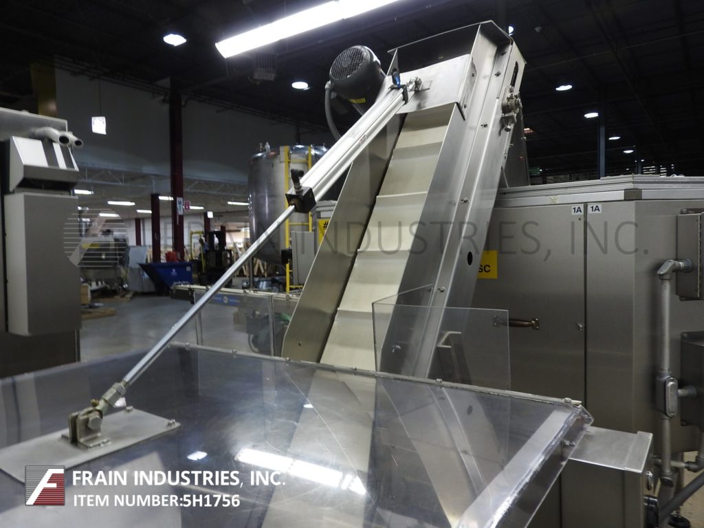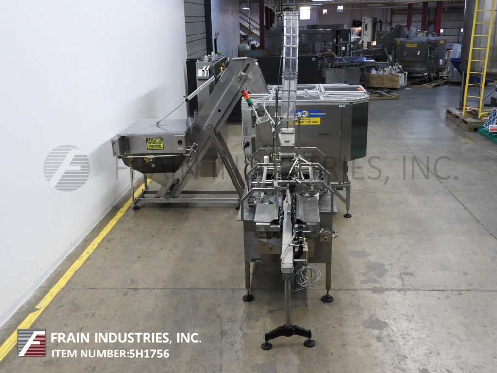 德l Packaging, Model ASRL-CC-401, automatic, stainless steel, inline overlidder with inclined cleated and centrifugal feeders. Rated from 50 to 300 containers per minute – depending on materials, application and machine configuration. Container size range: 2" to 7" in Diameter; 2" to 12" in Height with proper change parts. Equipped with stainless steel incline cleated feeder with 46" long x 40" wide x 40" deep stainless steel product hopper and pnuematic plastic lift up cover, 96" long x 11-1/2" wide inclined cleated belt with 2-1/4" high cleats on 8-1/2" centers to 60" OD rigid disc high speed centrifical bowl feeder to air conveyor designed to transport the lids from the bowl feeder to the overlidder that has a 132" long x 4-1/2" wide plastic Delrin conveyor belt with 15" and 32" long container worm screw in feed, 36" long cradle chain container handling conveyor with dual gripper pockets, 4-1/16" wide lid chute and 15" long roller lid compression section. Remote control panel with AB PLC controller with variable speed controls and on board control pad with start, stop, jog and e-stop