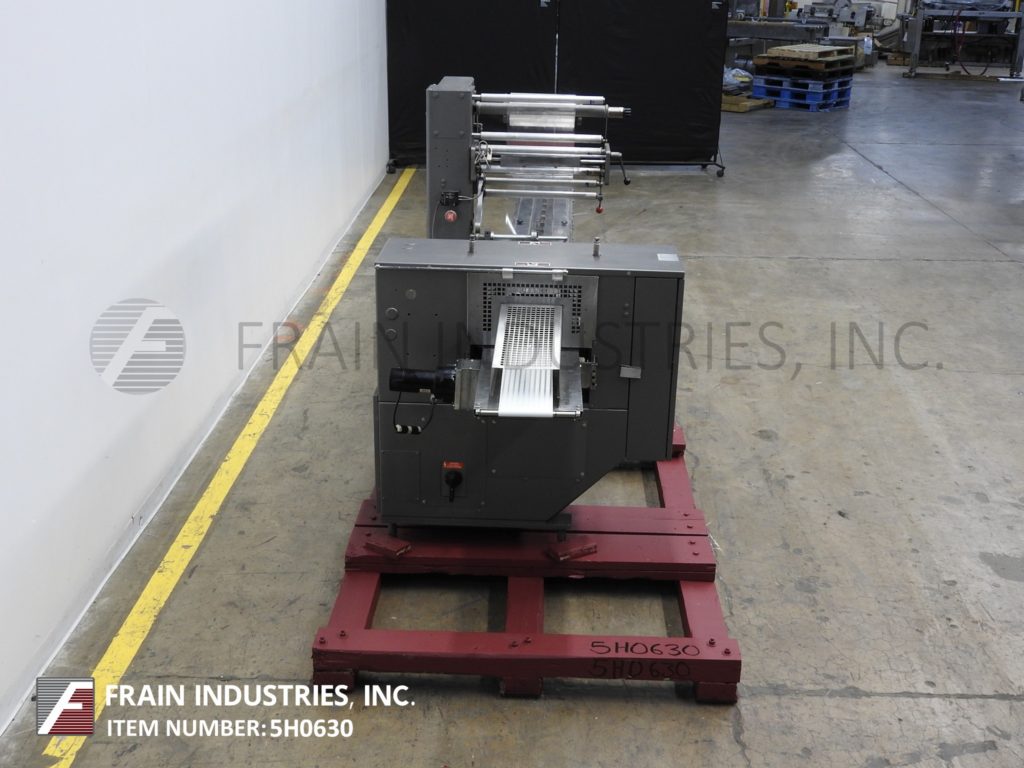 Doboy,卡片,卷,扁平板。每分钟80到200卡 - 取决于材料和应用。卡尺寸范围:3“至5½”的长度;3“到8”的宽度。配备啮合和断开手动手动控制器和最多9英寸宽卷库存,其中6“芯,28”最大斜辊直径。9¾“长驱动滚筒和卡截止。操作卡片序列从供应辊和推动滚筒中拉动,将卡片存入截止到较小的碎片中,并在产品包裹之前沉积在包装器进料输送机上。