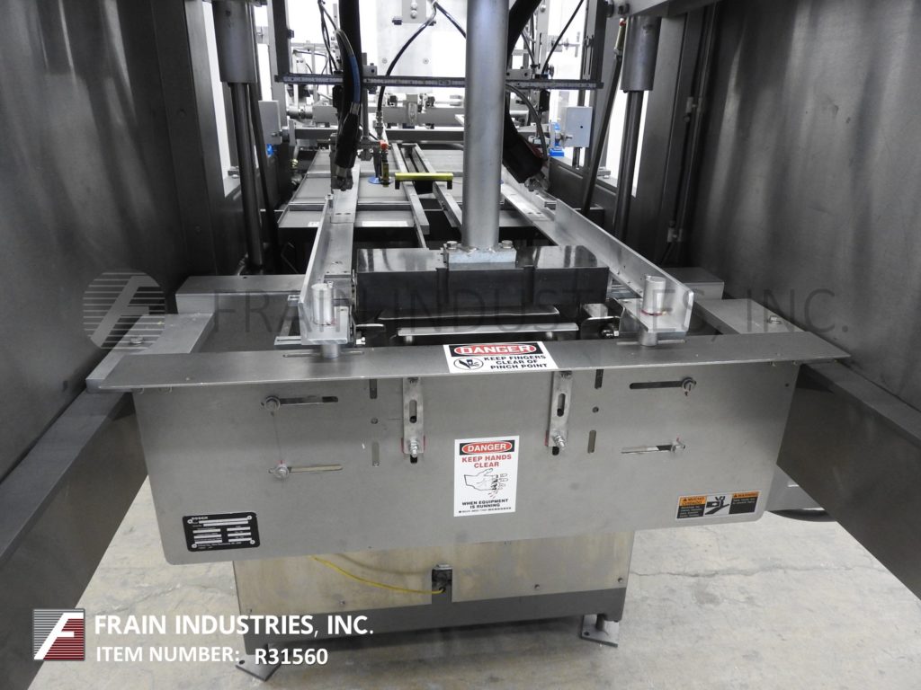 Doboy,751型,自动,单头,托盘前。每分钟10到60托盘 - 取决于材料,应用和机器配置。托盘尺寸范围:4“至20”的长度;3“到17”的宽度;高度1“至6”。配备36“长动力空白托盘杂志,(3)吸盘真空灶挑选,单机械成型头,Nordson(3)枪热熔胶系统,带戴头巾密封区和lexan升降机安全门。控制面板有触控器控制器,带手动/自动开关,真空开/关开关,按钮前进/停止和e-stop。安装在(4)腿框架上。