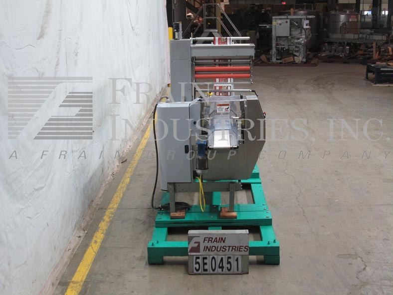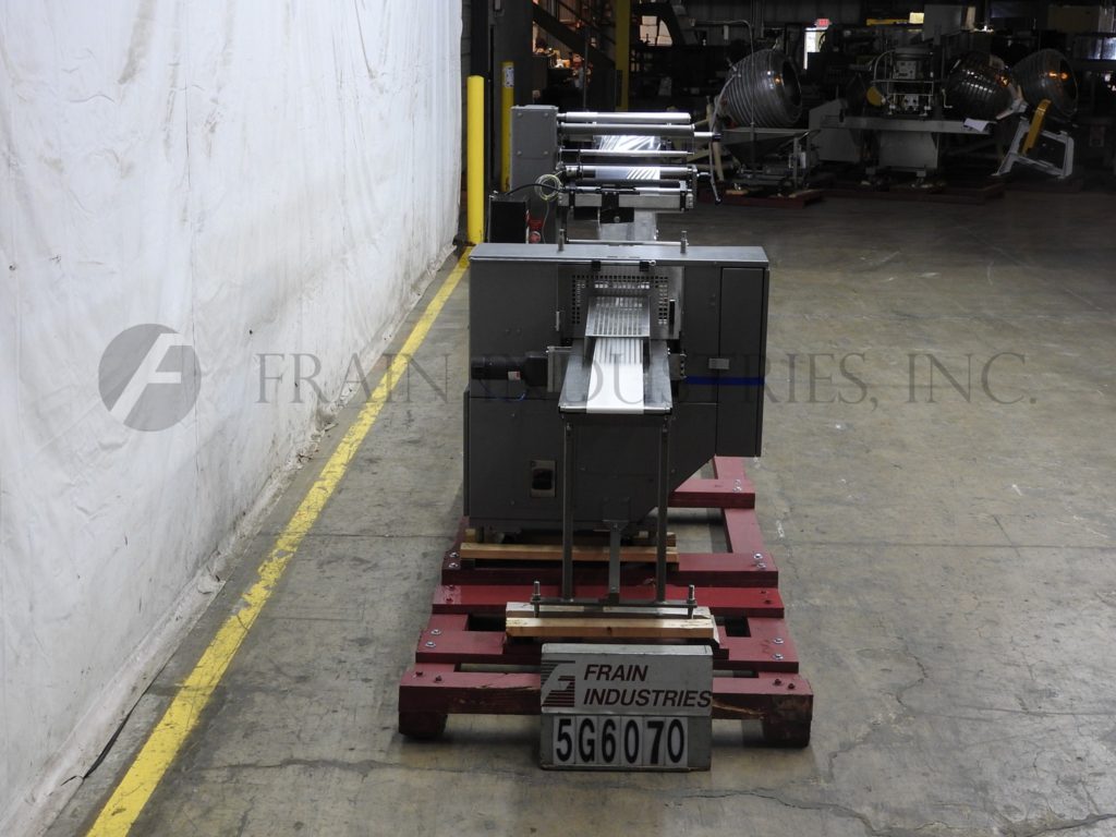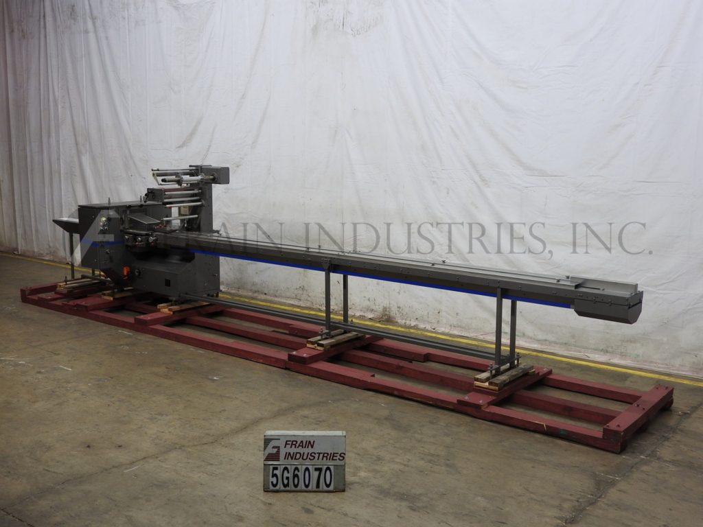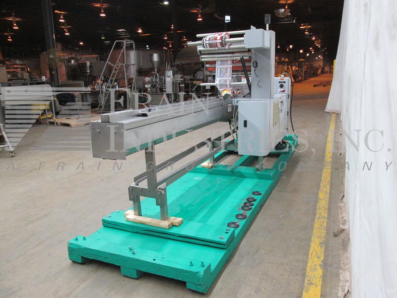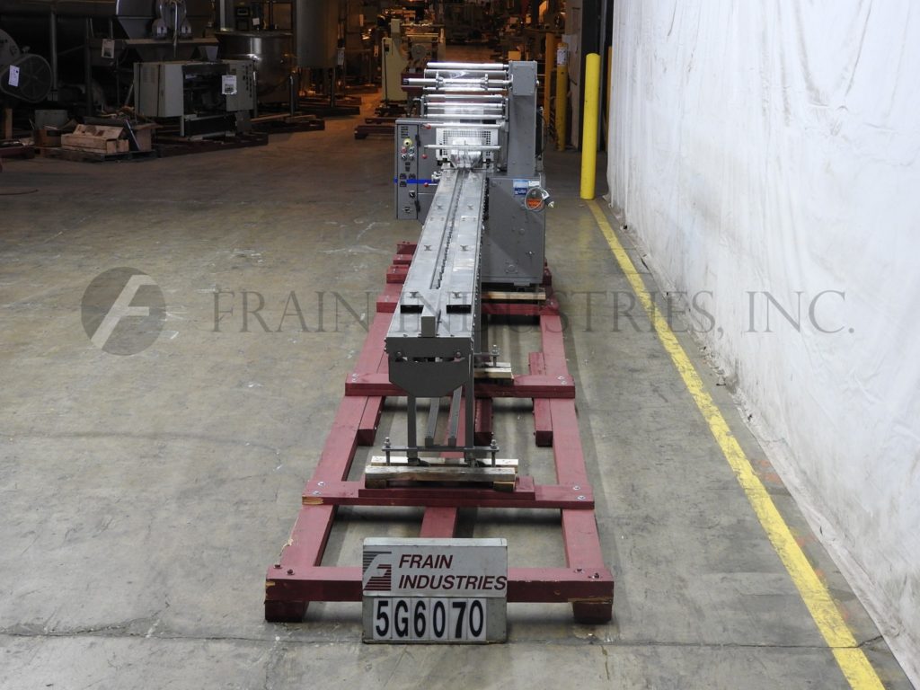Doboy, Model Mustang IV, 2-up,卧式包装额定每分钟30至150包-取决于材料和应用。包装尺寸范围:3"至18"长度;½"至6"宽度;1/16“到3¾”的高度。配备200"长的运输链在饲料与1"高凸耳在5"中心,薄膜注册,成型站,(3)组鳍轮(2)拉(1)密封,7"宽2向上十字密封钳,不锈钢安全保护。控制面板与密封颚温度控制器与开始,停止,e-停止按钮控制,和54“长× 7”宽卸料输送机。安装在基础框架与锁定脚轮和水平腿。薄膜规格:宽度可达20英寸;高达16英寸直径,3英寸芯。