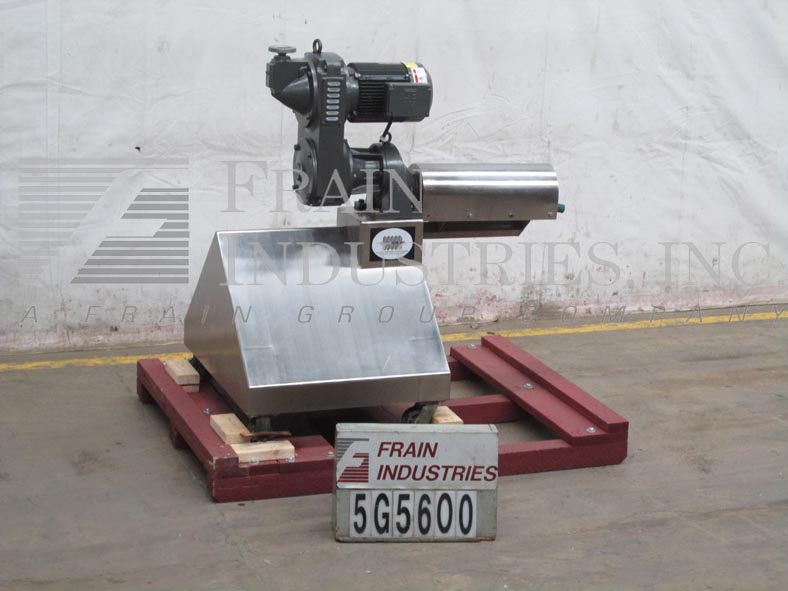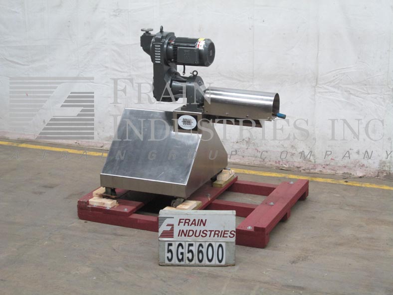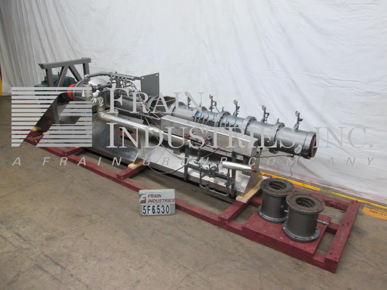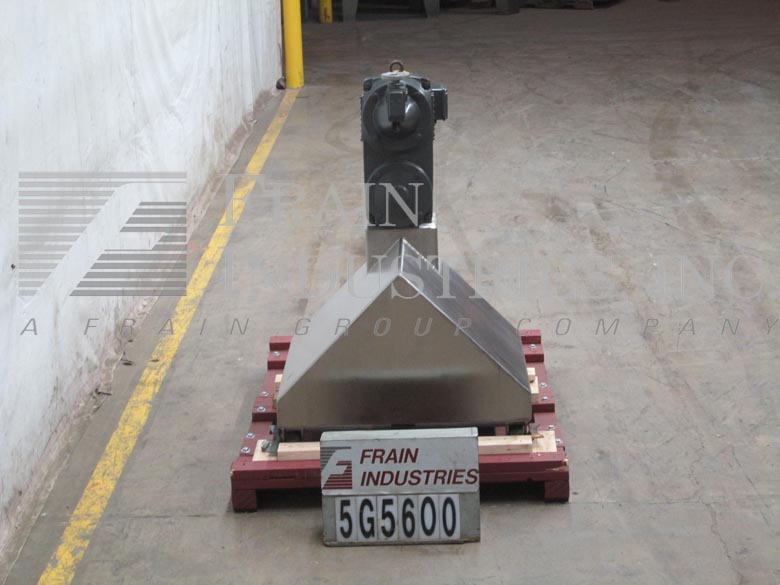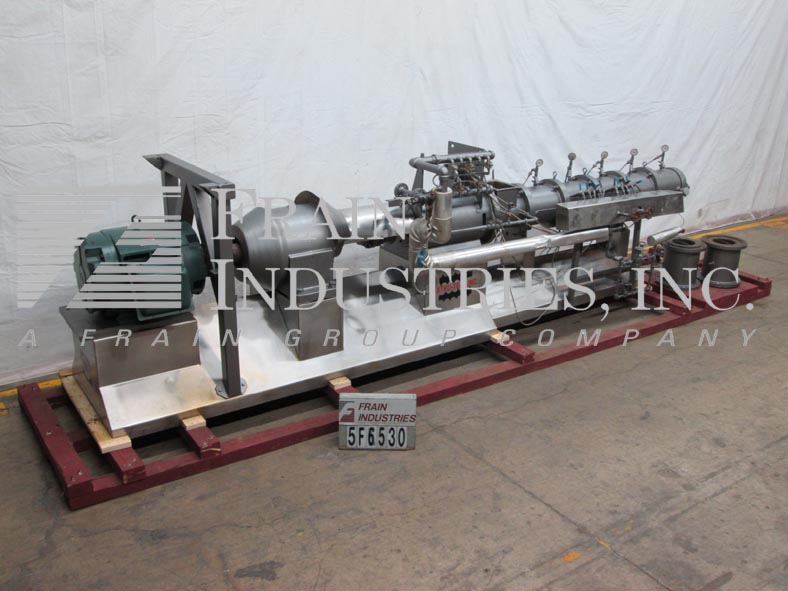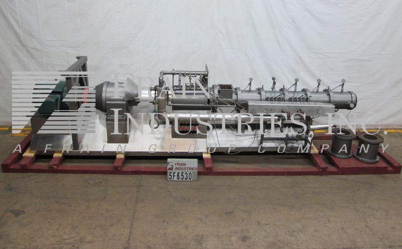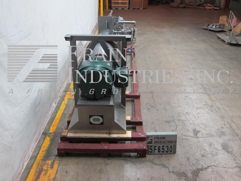 Extrutech型号E-925,内联(5)区,单螺杆挤出机,生产率为10,000至33,000磅的猪肉风格狗粮或每小时10,000至26,000 IBS,每小时猫类食品。配备9“X 11”产品进给料斗,10“OD单螺钉,在长法兰筒段中具有(5)18”,具有18英寸od(6)7/8“螺栓孔8”中心和9-1 /2“ID。(2)部分有夹套和用于将水或蒸汽注入桶区段的端口,以控制挤出温度,所有具有VFD控制面板的单个温度测量为0至240°F和8-3 / 4“OD端产品排放口。安装在重型占用底架上。