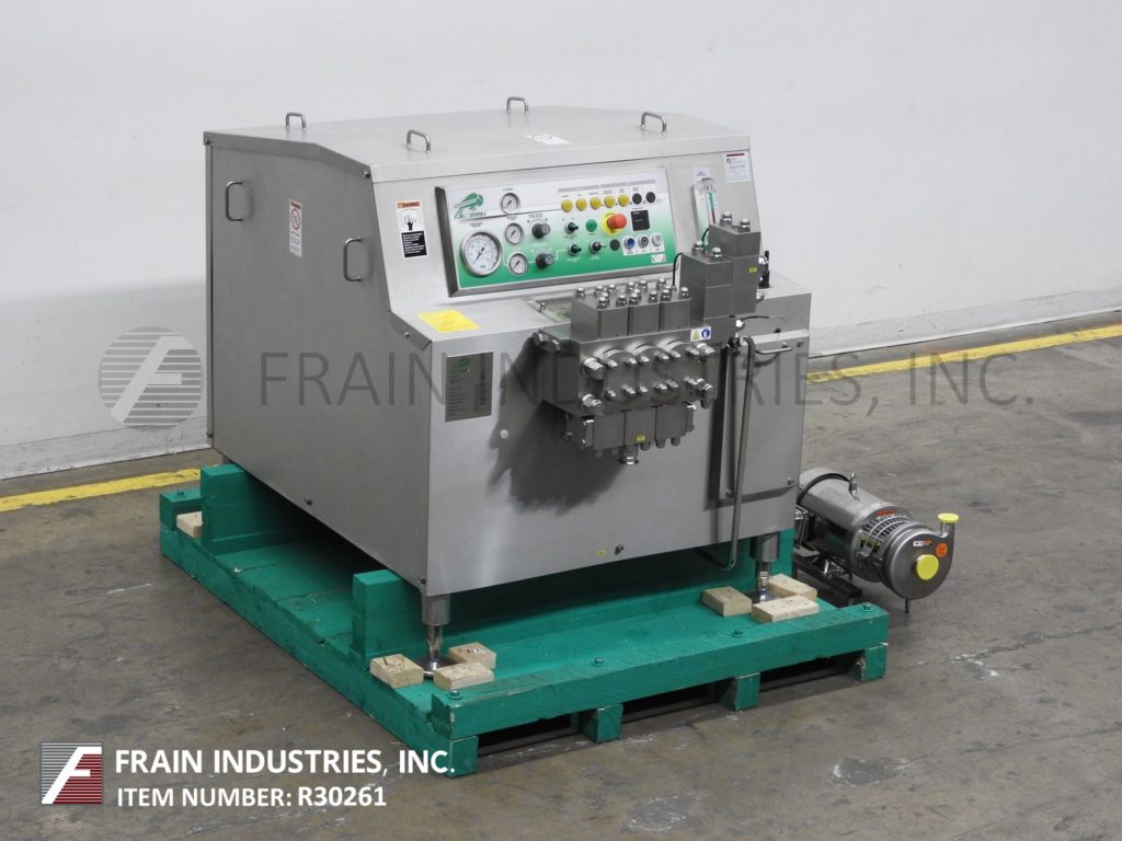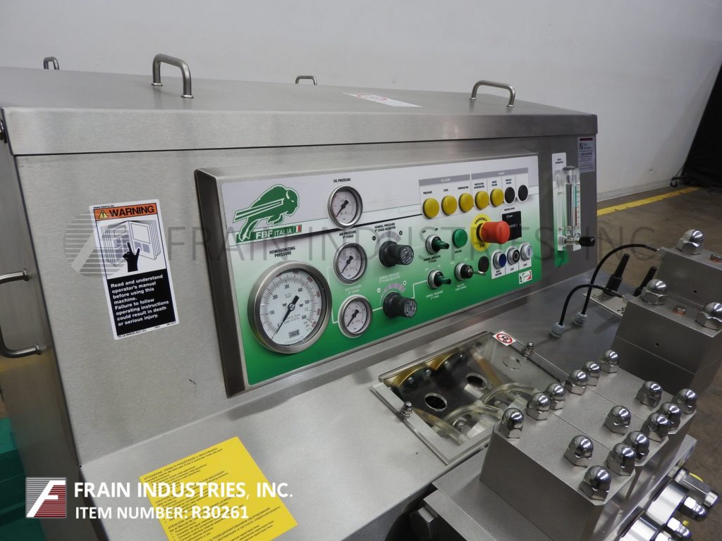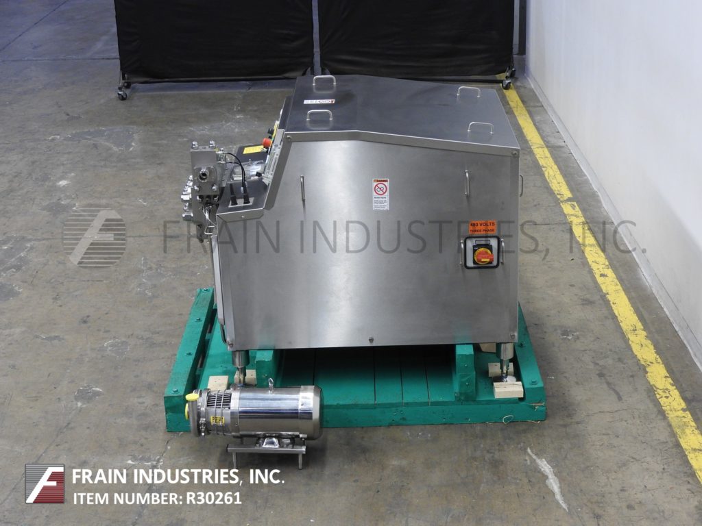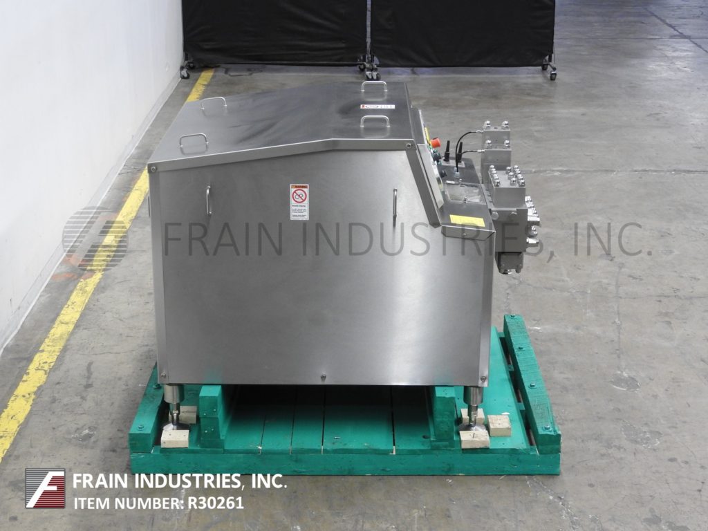 FBF意大利,FBF4022/3A型,两级均质器,额定产量为每小时792加仑-取决于材料,应用和机器配置。最大工作压力可达2886 psi。配备半球形供、吸阀。气动均质阀执行器组件,2½”OD / 1½”ID三钳式充电端口,2½”OD / 1½”ID三钳式排气端口和压力表最高可达6000psi。安装在(4)腿重型基础框架。