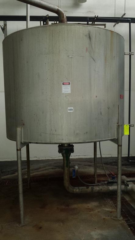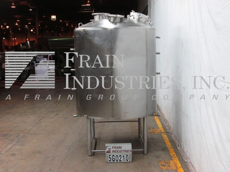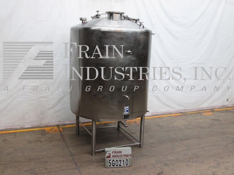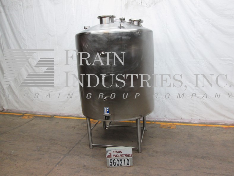 费尔德梅尔,1200加仑,316不锈钢,单壁罐。78"直径x 60"直壁。容器有一个圆顶顶部,一个7”ID,一个6.5”ID,一个6”ID端口,以及两个19”人的方式与启闭盖子。侧壁有一个7.5"直径四螺栓模式法兰配件3.25" ID和一个2.5"螺纹端口。盘底有一个11"直径8螺栓模式法兰排泄与18"接地间隙。安装在四个不锈钢腿上。