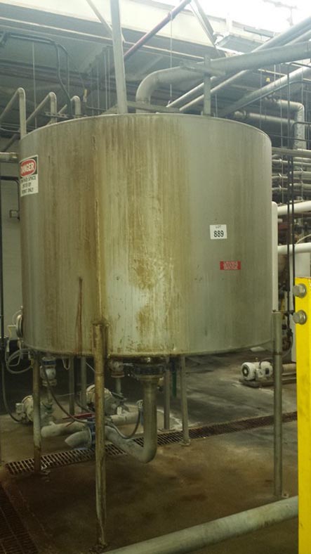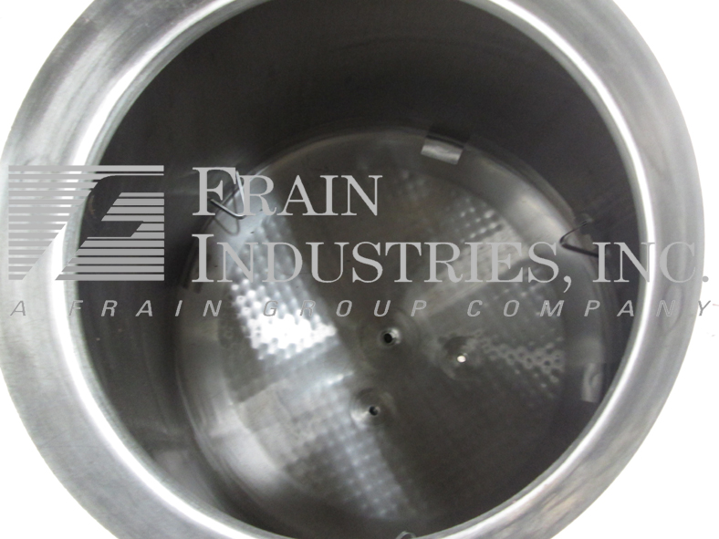 费尔德迈尔,绝缘,600加仑,316不锈钢(接触部件)单壁罐。60”直径x 50”直墙。容器有一个圆顶顶部(1)2”ID(1) 3”ID(1) 3.75”ID端口和一个18”提升和螺栓下降盖人方式。侧壁装有一个温度探头。盘底有(1)4“ID中心排料,31”接地间隙和(1)2”螺纹排料,偏离中心,25”接地间隙。安装在(4)不锈钢腿上。