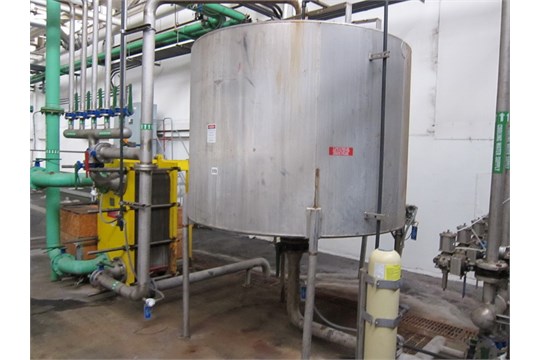 费尔德梅尔,1000加仑,304不锈钢,3区夹套罐。容器尺寸:直径72";72"直墙。额定压力:MAWP: 100 psi @ 350°F;MDMT: -20°F @ 100 psi。配备圆顶顶,20”直径的人方式螺栓向下盖,一个6”直径法兰卫生顶部端口,一个5”直径法兰卫生顶部端口,两个4”直径法兰卫生顶部进口,一个16”直径法兰卫生顶部进口,一个13.5”直径法兰卫生顶部进口,1.5”外径螺纹夹套进口/出口,盘子底部与扁平不锈钢盖,四个1.5”外径底部侧出口,以及一个外径5"的卫生法兰中心底部排水管,带有关闭阀和28"的接地间隙。安装在不锈钢腿上。
