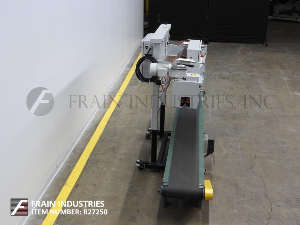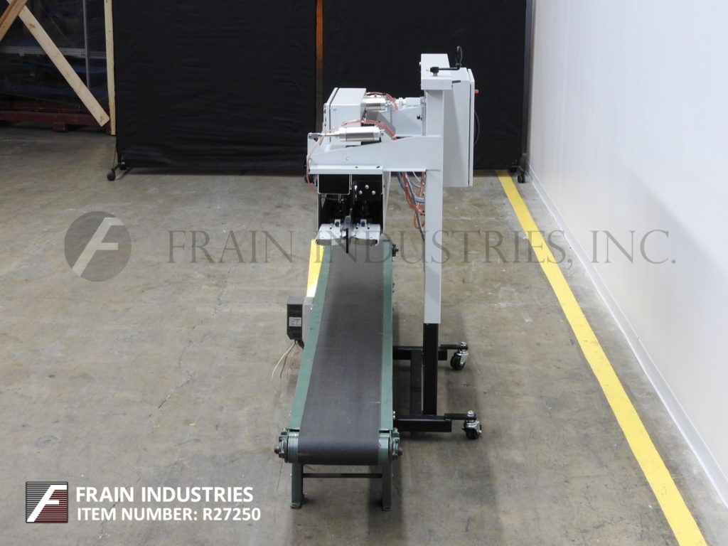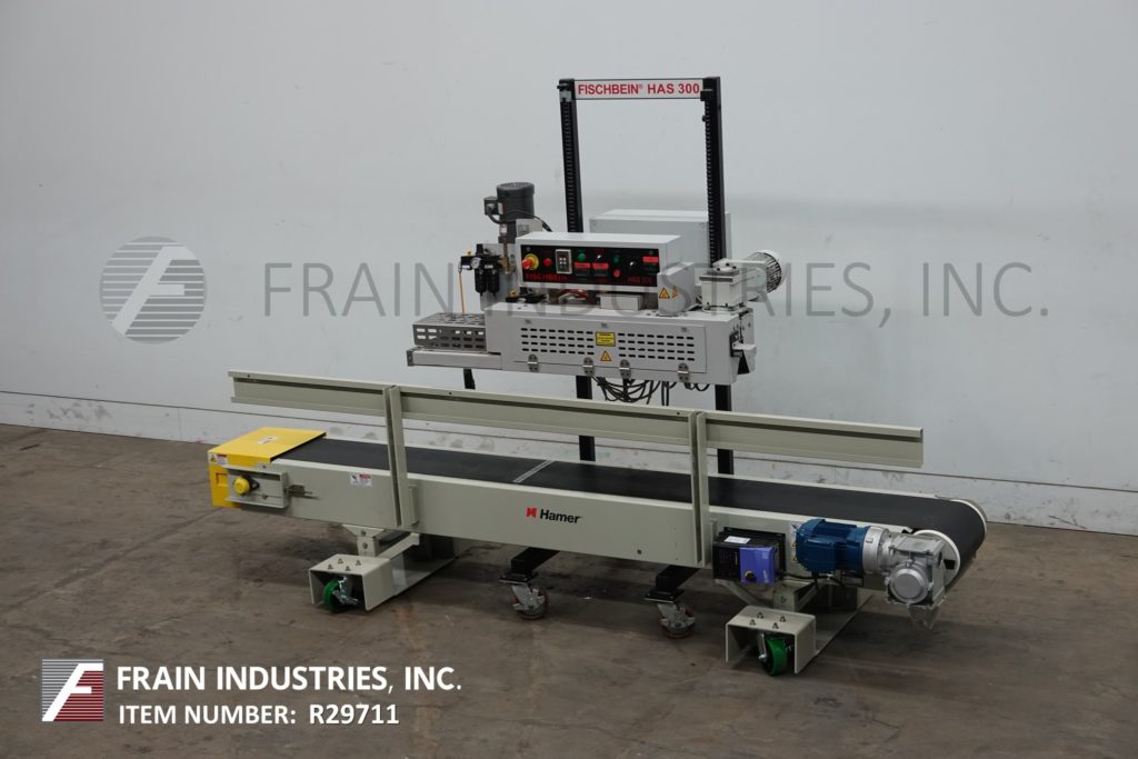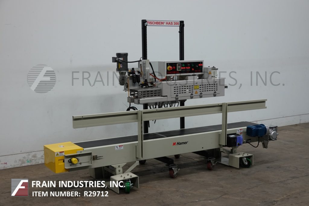 Fischbein, Model HAS 300,从左到右,热气囊封口机额定从30到60线性英尺每分钟袋的数量-取决于材料,应用和操作者的灵活性。将运行大多数热密封枕头和gusseted袋与最大袋厚度10密尔和自由袋顶部6"最小。配备了48英寸长的双压缩带密封部分,并安装在12英寸宽x 108英寸长的皮带输送机之上。控制面板有按钮启动/停止。数字触摸板控制的热量,辊张力和空气压力。升降开关及变频调速控制。安装在带有脚轮的可调节高度的动力底座上。