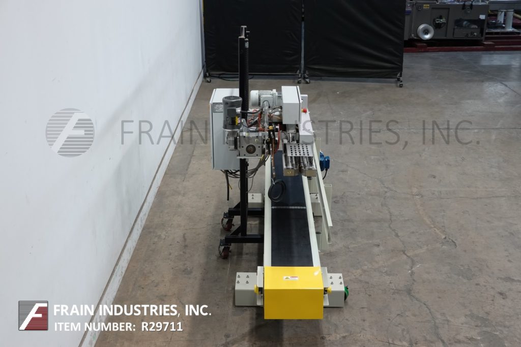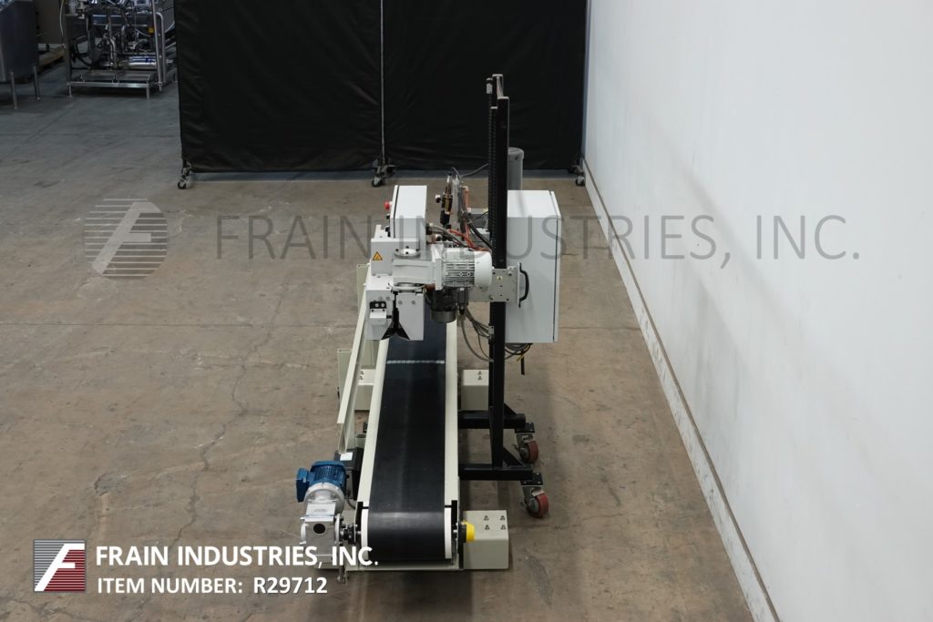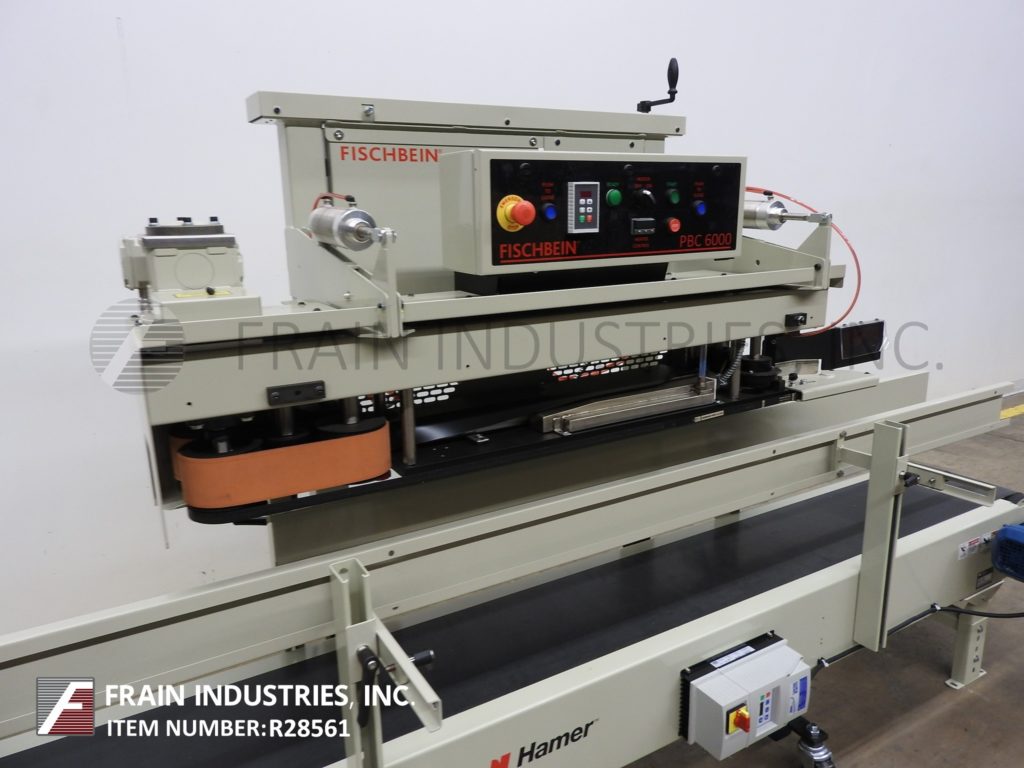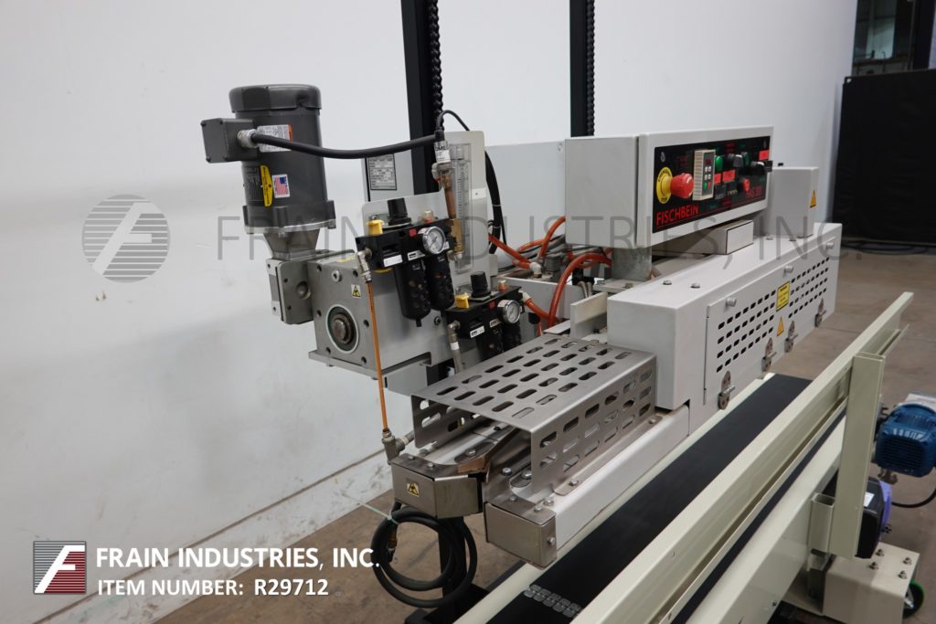 Fischbein PBC 6000型,从右到左,预涂胶,袋热封口机额定从0到85线性英尺每分钟袋的数量-取决于材料,应用和操作者的灵活性。袋大小范围:4"至26"宽度至56"长度。装袋重量从1磅到110磅,将运行大多数扣板和平袋。设有前分离通道,带单折犁的导袋器,电加热加热并激活预涂胶,压力可调12"长双压缩带段。控制面板有触控板,有加热器开/关和电机运行,自动,停止开关,袋堵塞检测,过温传感器关闭,有启动,停止,e-stop按钮控制。安装在手动曲柄高度可调的基础框架与脚轮和10 '长x 12"宽黑色PVC产品皮带输送机。