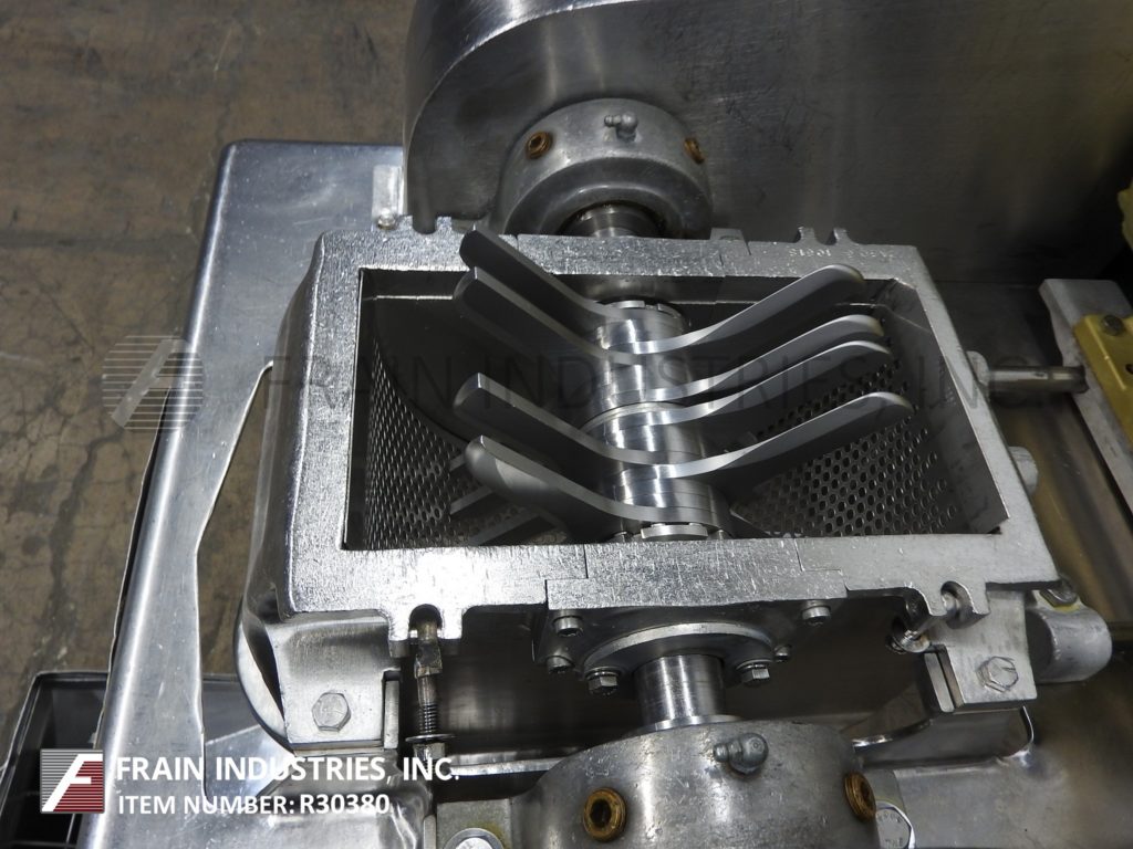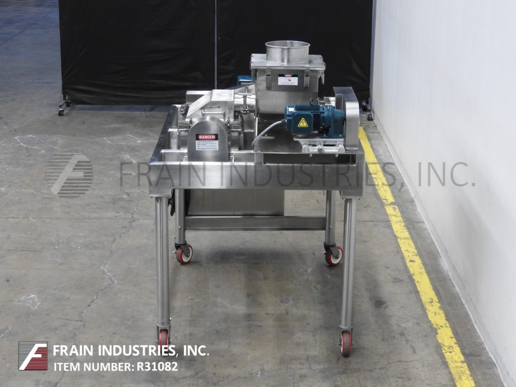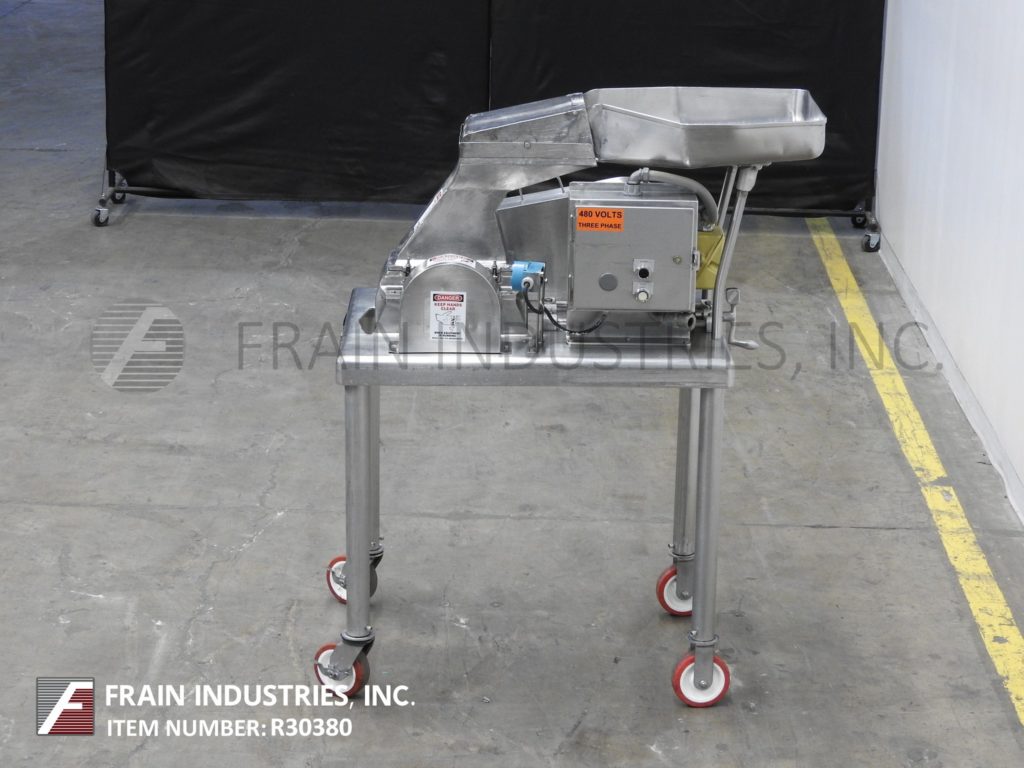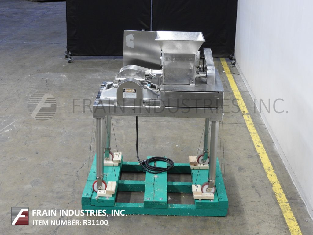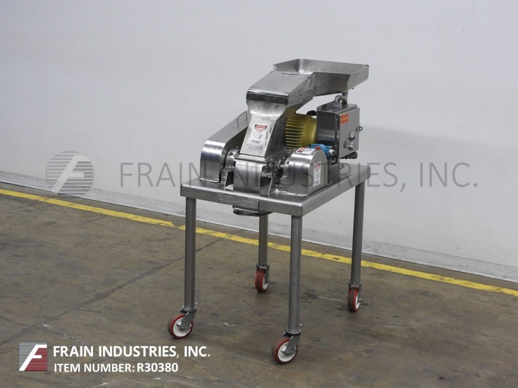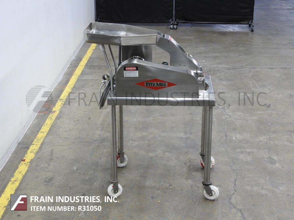 Fitzmill, Model D, stainless steel hammer mill. Equipped with 12" long x 12" wide x 12" deep (½ ft³) product hopper, 3" diameter feed screw with 2" centers powered by ¼ HP drive with variable speed gearbox and (16) 3½" long x 1" wide fixed knife / impact blades. Product discharge is 15”L x 5½” W with 36" of ground clearance. Mounted on (4) leg mild steel frame with casters.